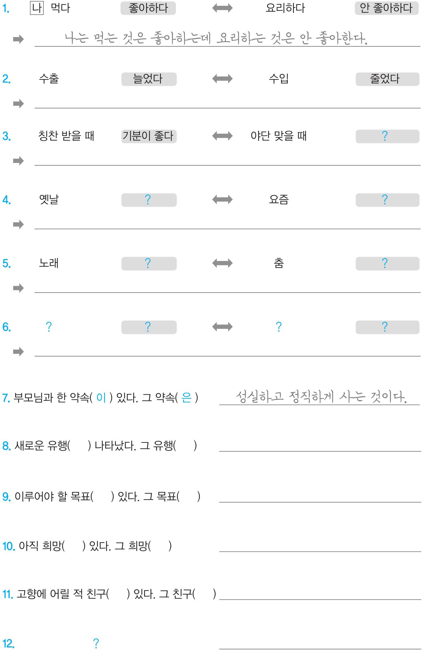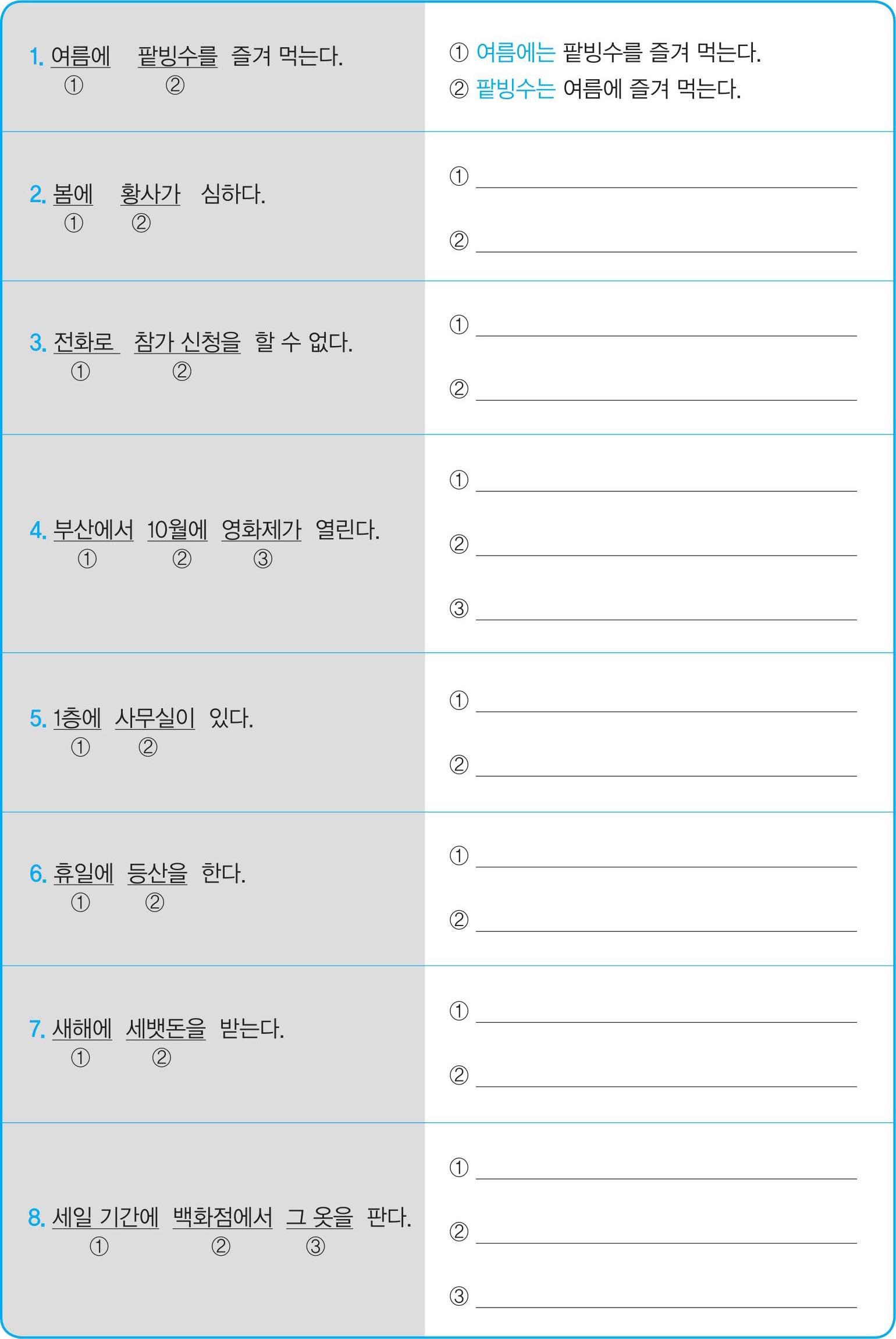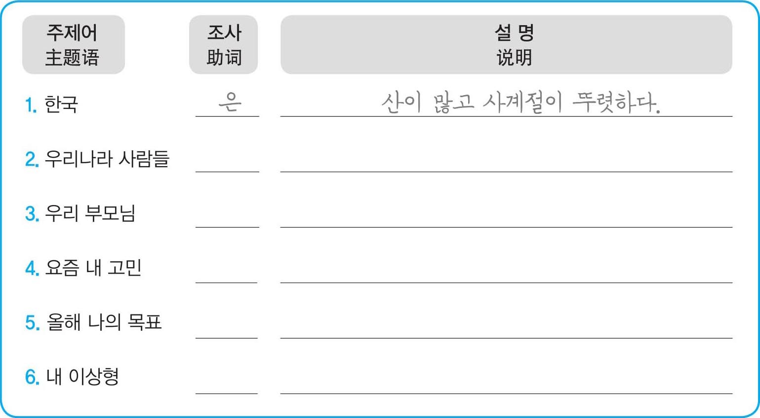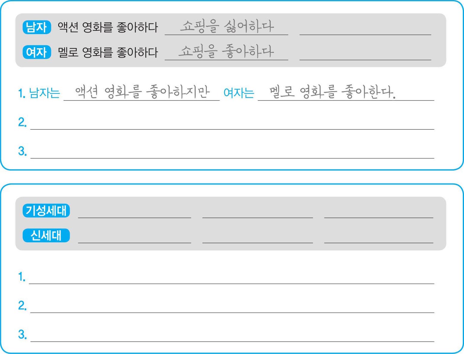 다음 줄임말을 조사가 있는 완전한 문장으로 써 보세요.
