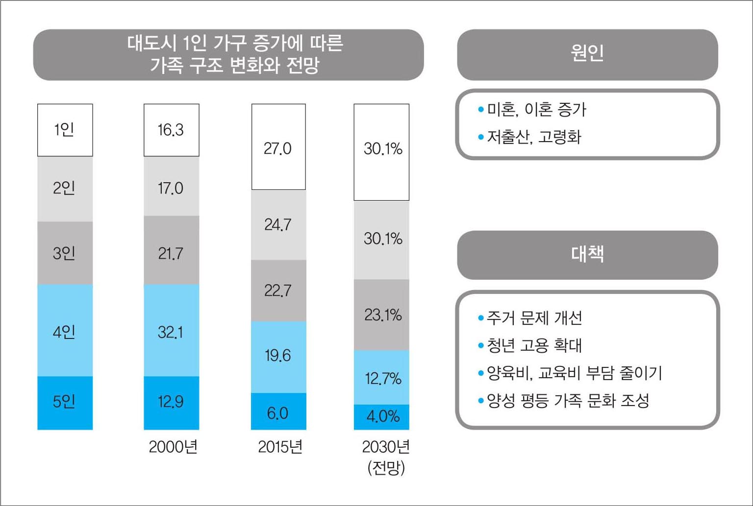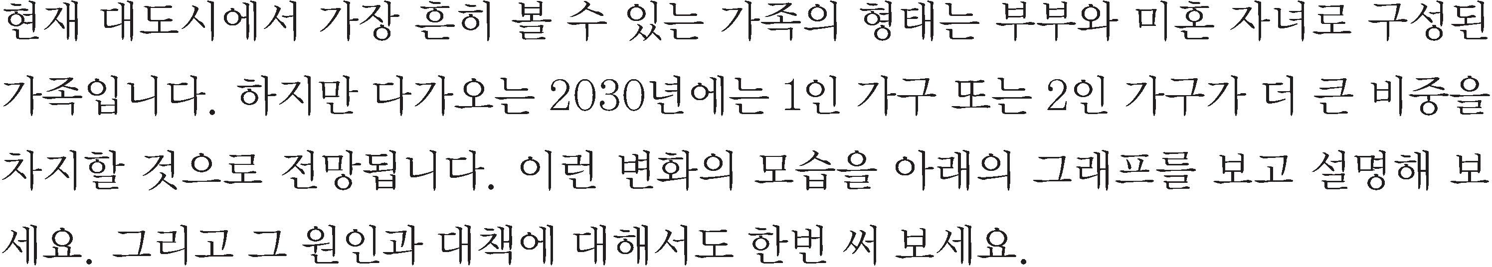 当下,大城市中最常见的家庭模式是夫妻与未婚子女所组成的家庭。但是数据显示,在即将到来的2030年,一人家庭和两人家庭将占据更大的比重。请参照下列图表,对这一现状进行说明,并写出其原因与对策。