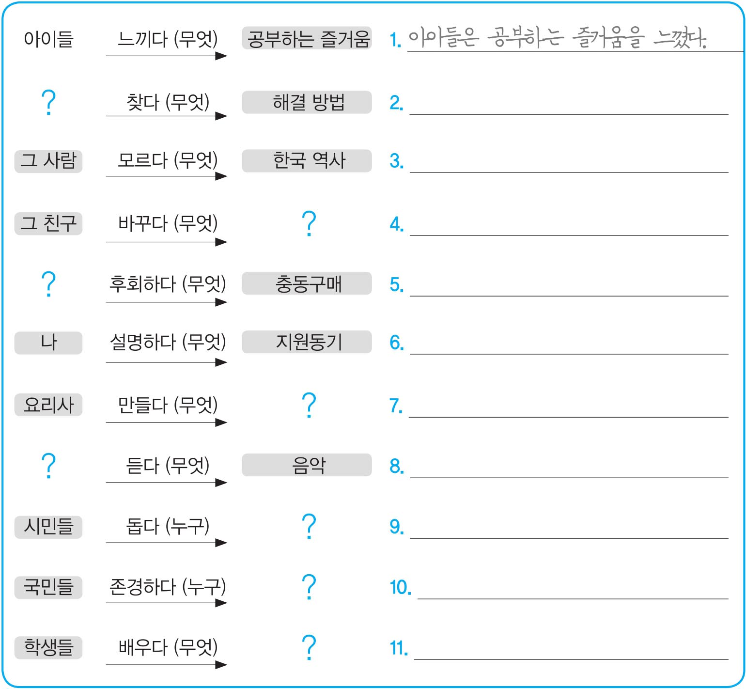 11.우리/한국 문화/관심/많다  ➞ ______________________