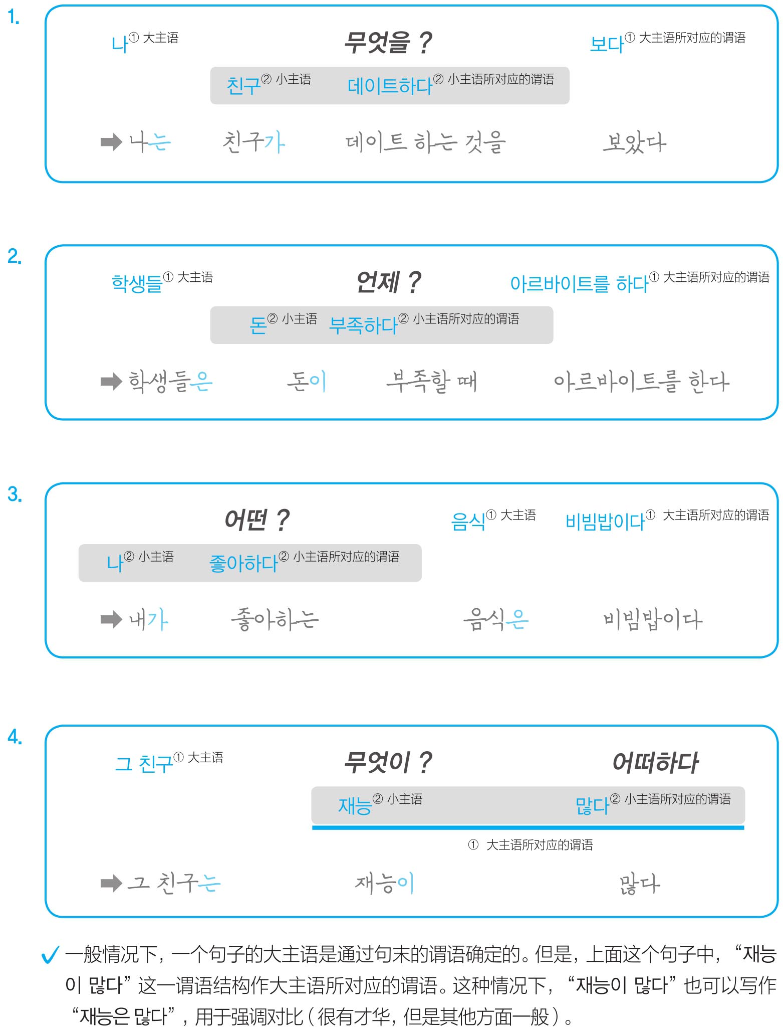 句子中的大主语用“은/는”,小主语用“이/가”(大主语有时也可以用“이/가”)。