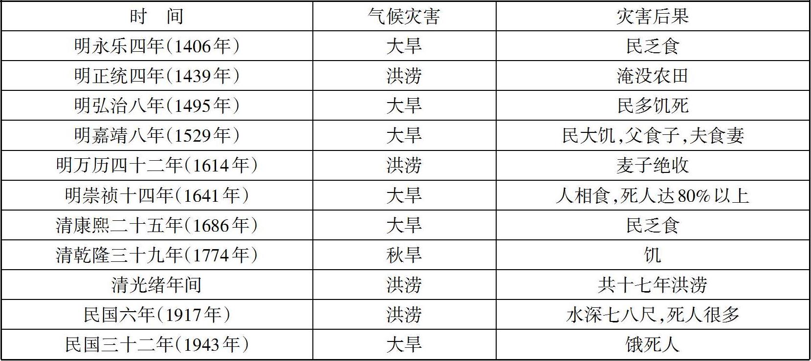 传统历史时期,清辉头村遭受的气候灾害主要是洪涝与干旱。气候灾害如果是洪涝,水退了以后侥幸的情况下还有部分收益,但是严重干旱所造成的影响往往是颗粒无收。清辉头上历史发生的气候灾害如表2-5所示。