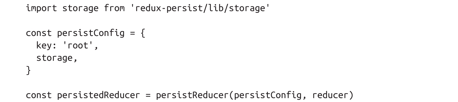 storage变量指定我们将在何处持久保存Redux状态:默认保存在localStorage。根据persistConfig,我们要将状态保存在一个名为persist:root的localStorage项中。当Redux状态改变时,persistedReducer将使用localStorage.setItem('persist:root',...)创建或更新状态副本。现在,我们需要用persistedReducer创建Redux store: