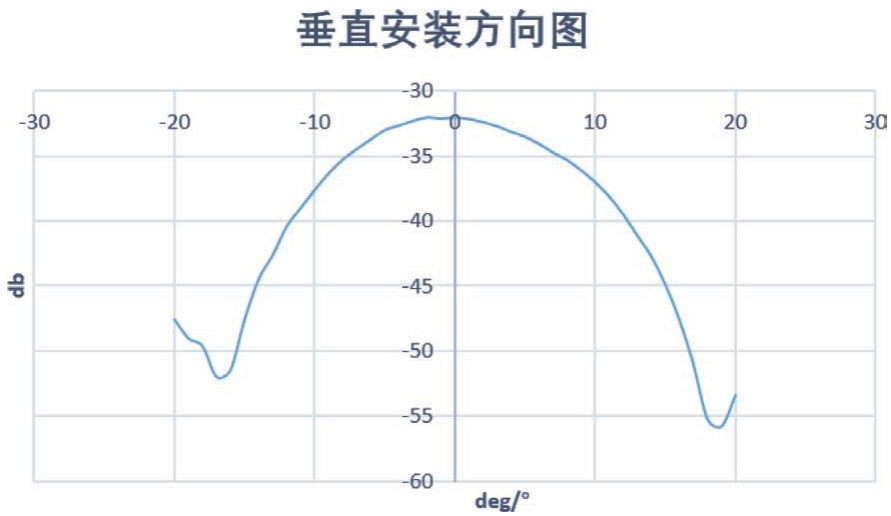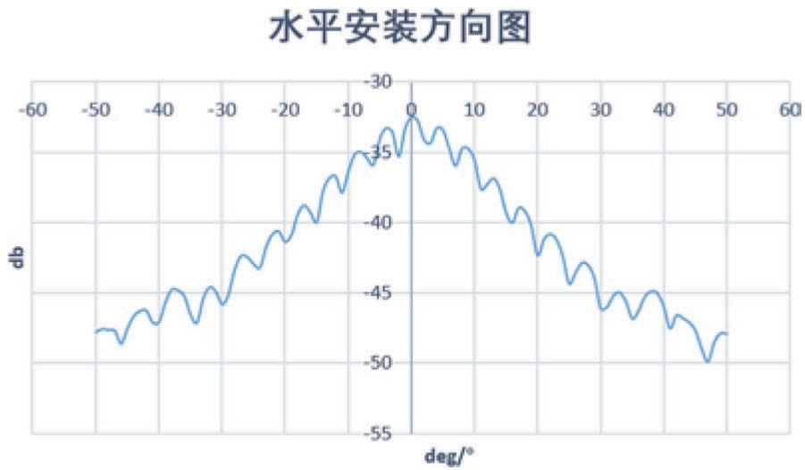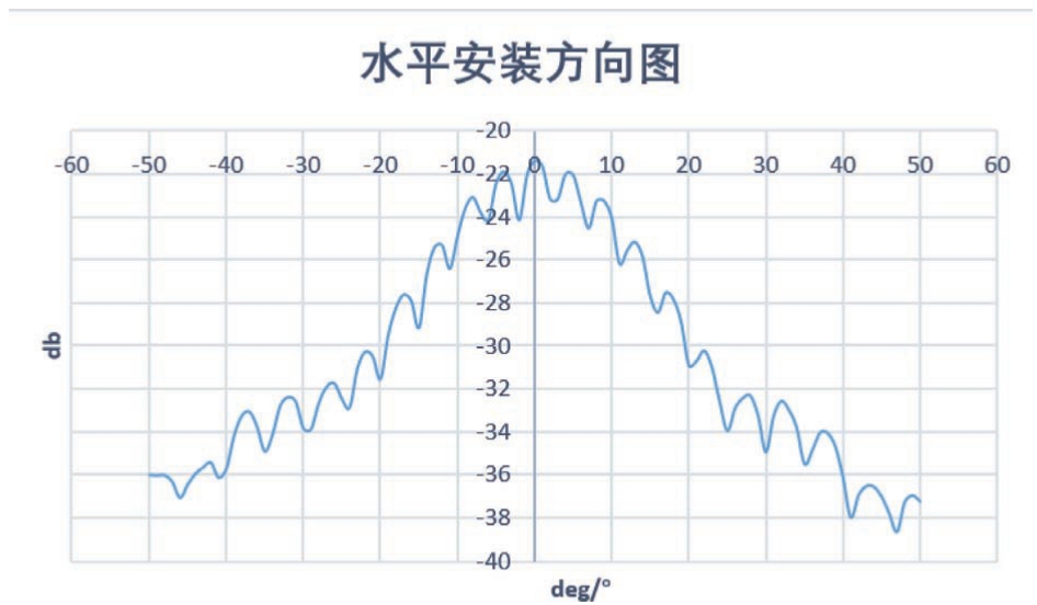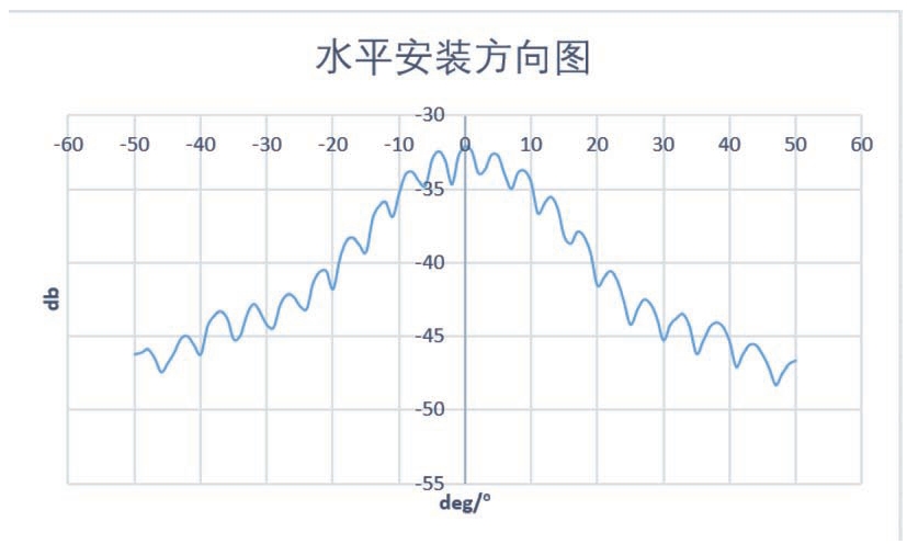 将被测雷达安装于转台上面,使用激光定位方式确定被测雷达裸件和射频前端接收天线处于同一水平方向,然后将转台设置为水平方向±50°角内的方向图和垂直方向±20°角内的方向图。水平方向见图6,垂直方向见图7。