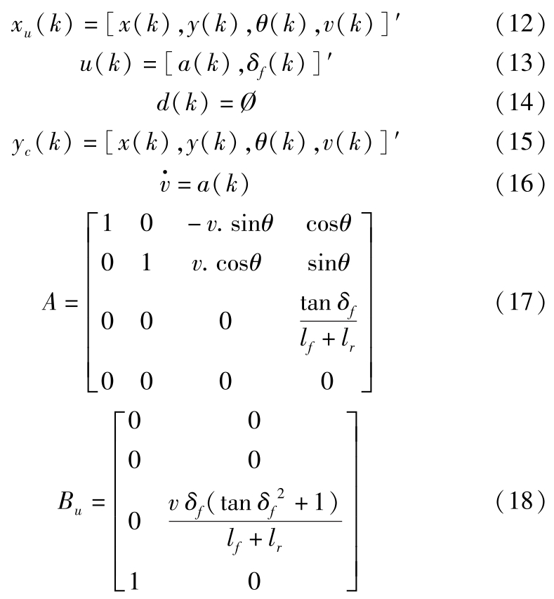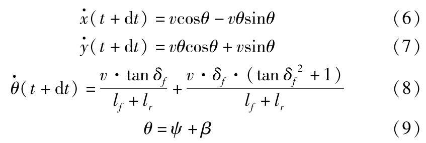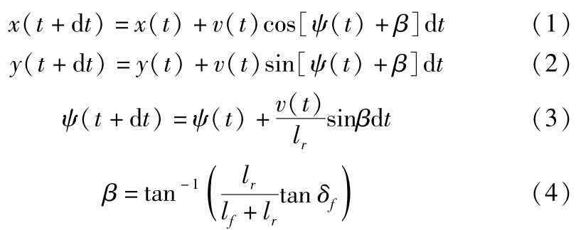 式中, x 和 y 是车辆纵向和横向位置; ψ 是车辆航向角; l f 和 l r 分别是质心和前轴以及后轴之间的距离; δ f 是前轮转角; t 是当前时间;d t 是采样时间; β 为质心侧偏角。
