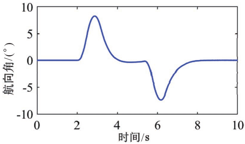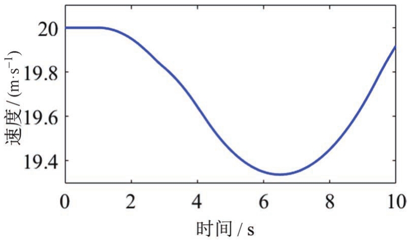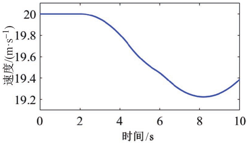主车行驶过程中的速度如图7所示,车辆速度在避障过程中减慢,最低速度为19.33m·s -1 ,在避开障碍物后车辆会逐渐加速。车辆航向角如图8所示,在避障过程中始终保持在±10°之间,规划的路径较为平滑,且速度变化平缓。