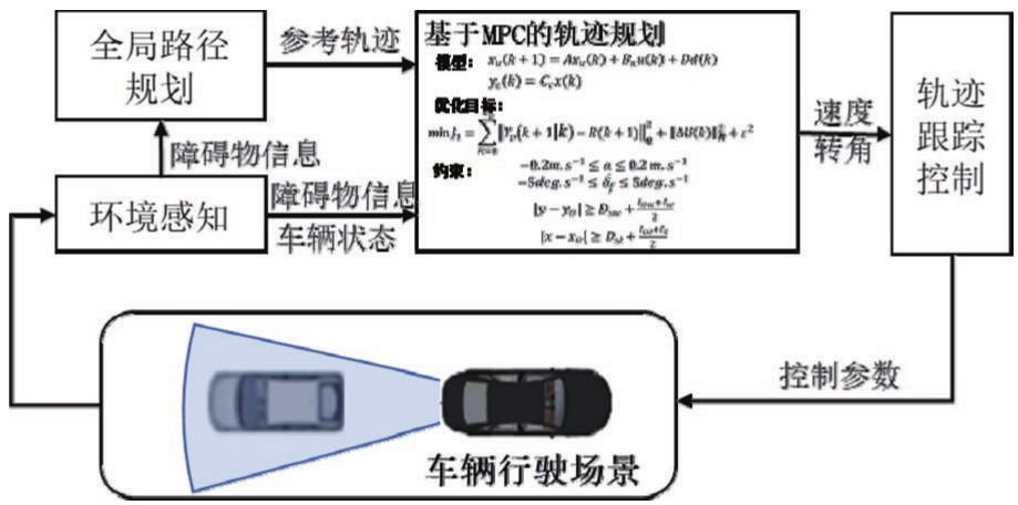 本节介绍基于MPC的路径规划算法,如图3所示。首先通过环境感知模块获取车辆周围的障碍物信息、车辆运动状态,通过全局路径规划模块获得参考轨迹。基于设计的轨迹规划算法得出速度和转角,传递到轨迹跟踪控制模块中,完成自动驾驶车辆的轨迹规划。