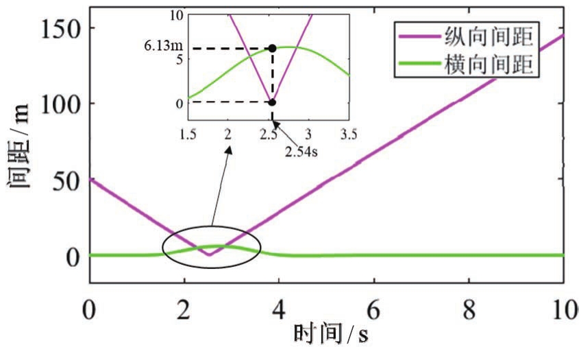 车辆避障过程中与障碍物的相对距离如图6所示。在2.54s时主车与障碍物的纵向间距为0,此时横向间距为6.13m,能够有效保证车辆的行驶安全。