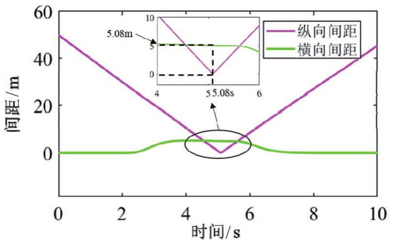 车辆避障过程中与障碍物的相对距离如图10所示。在5.08s时主车与障碍物的纵向间距为0,此时横向间距为5.08m,能够有效保证车辆的行驶安全。