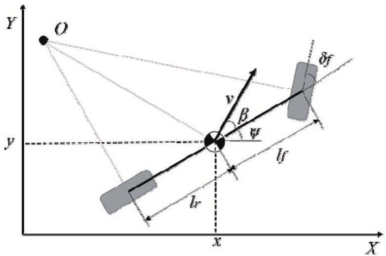 本文采用单轨模型描述车辆,如图1所示。该模型进行了如下理想化假设 [13] :①忽略车辆垂向运动;②忽略车辆的悬架特性;③忽略轮胎横、纵向耦合关系;④不考虑轮胎的横向载荷转移,以及认为轮距相对于转弯半径可以忽略不计,使用单轨模型来描述车辆;⑤忽略空气阻力。该模型中各个状态量的更新公式如下: