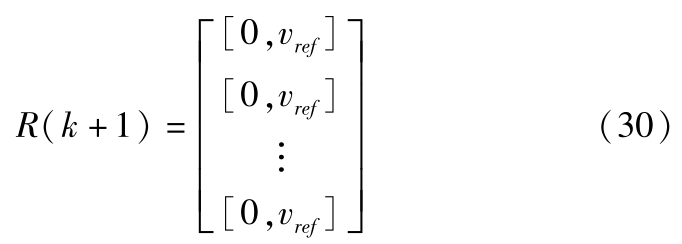 式中, ξ 为权重系数; ε 为松弛因子; Q 和 R 分别为输出误差与控制输入的加权矩阵; R ( k +1)为参考路径,即全局路径规划得出的路径,如下: