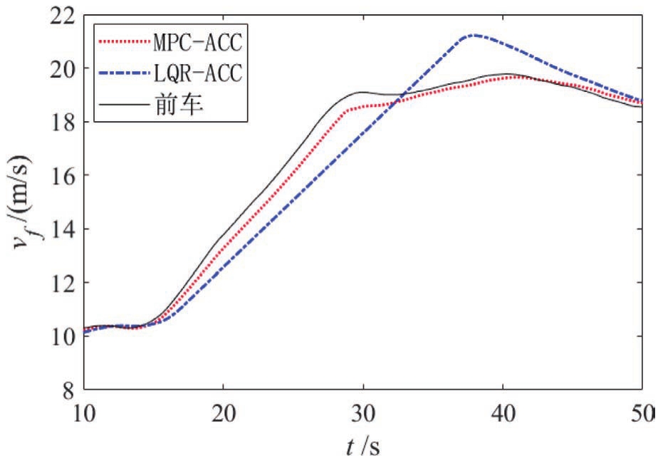 自车与前车初始速度皆为10m/s,前车于15s左右开始加速至18m/s,仿真结果如图7~图9所示。当前车加速时,LQR-ACC与MPC-ACC都进行加速,但从图8和图9可以看出,MPC-ACC先于LQR-ACC进行加速,这是因为MPC-ACC采用GP算法对前车加速度进行了预测。从图7和图8可以看出MPC-ACC的收敛速度明显优于LQR-ACC。