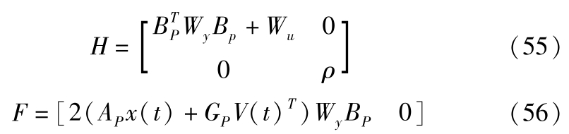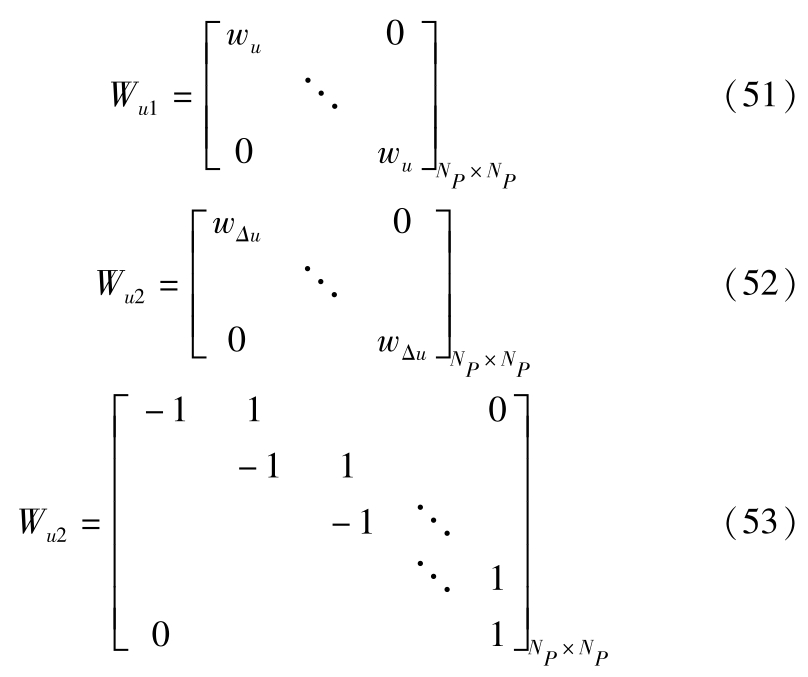 式中, k Δ d min , k Δ d max , k Δ v min , k Δ v max , k a min , k a max , k u min , k u max , k Δ u min , k Δ u max , k Δ d min , k Δ d max , k Δ v min , k Δ v max , k a min , k a max , k u min , k u max , k Δ u min , k Δ u max 为约束条件的松弛系数。因为式(29)为安全约束,不能进行松弛化。二次规划系数矩阵满足