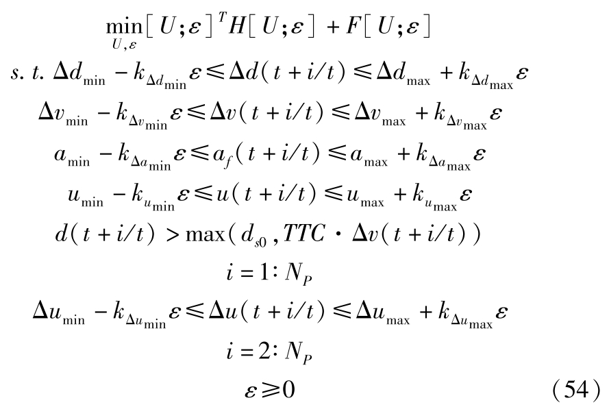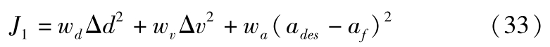 在ACC设计过程中,必须在确保安全性的前提下,综合考虑驾驶人的舒适性和燃油经济性。因此,采用二次型性能指标以及线性不等式约束形式,将纵向期望加速度的决策问题转化成带约束的在线QP二次规划问题 [5] 。