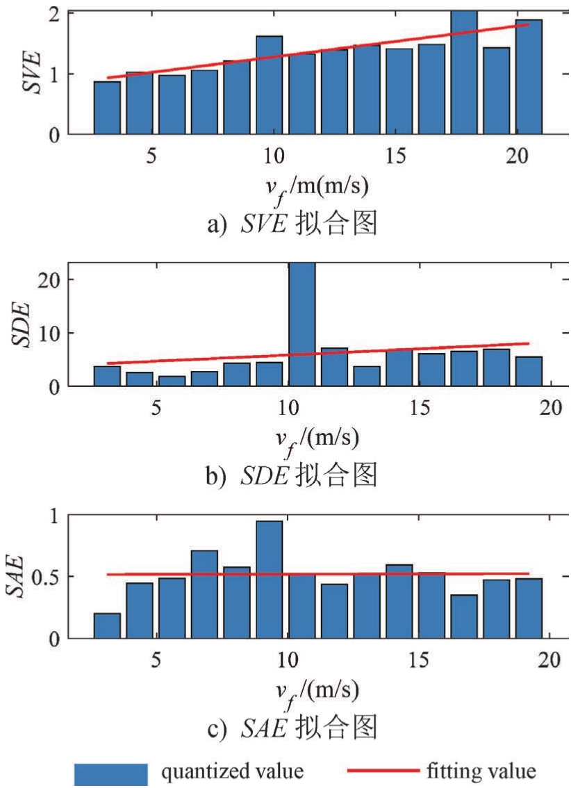 采用最小二乘法对其进行拟合,结果如图5所示。可以看出,随着速度增大, SVE 和 SDE 也增大,这说明高速时驾驶人对车辆状态的敏感度降低。但是 SAE 随着速度增大而略微减小,这是因为高速时,驾驶人更加注重对车辆的掌控,虽然对车辆状态的误差敏感度下降,但是对操作信息的敏感度增大。