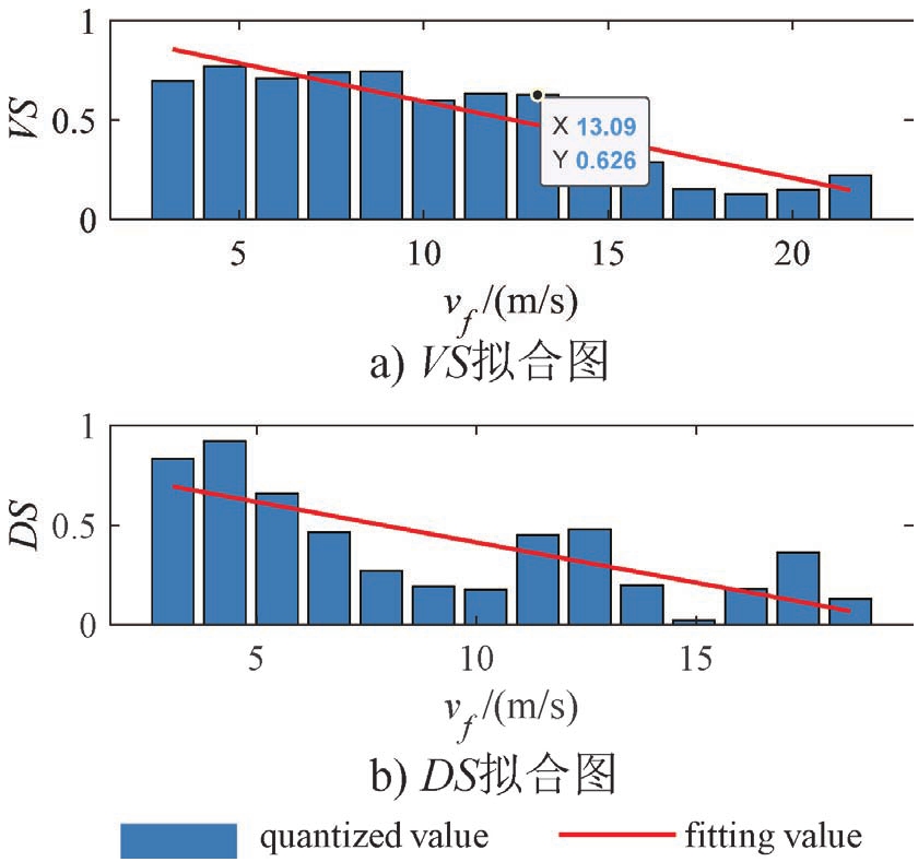 式中, k VS , d VS , k DS , d DS 为常量参数。为了求取这些参数,首先对 VS 和 DS 进行量化,这里用相关性系数来量化 VS 和 DS 。
