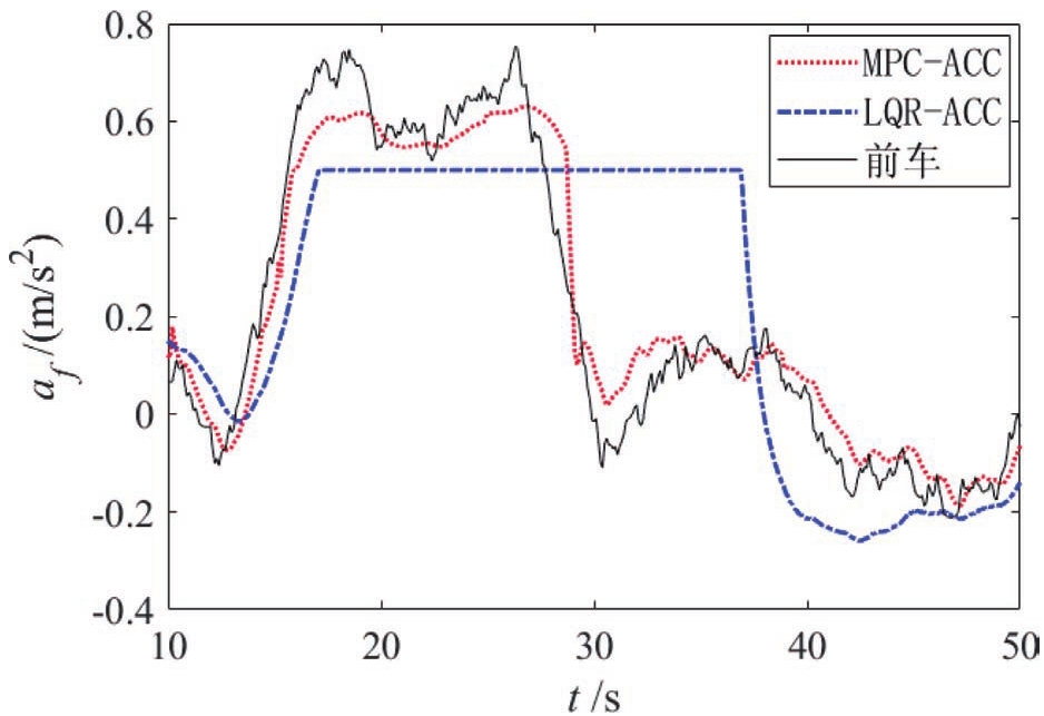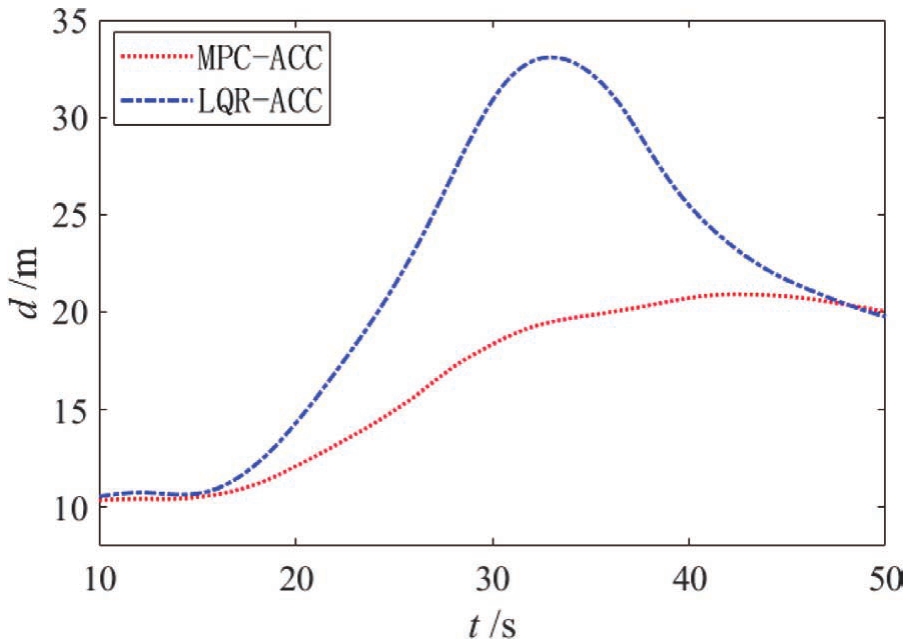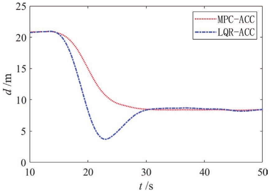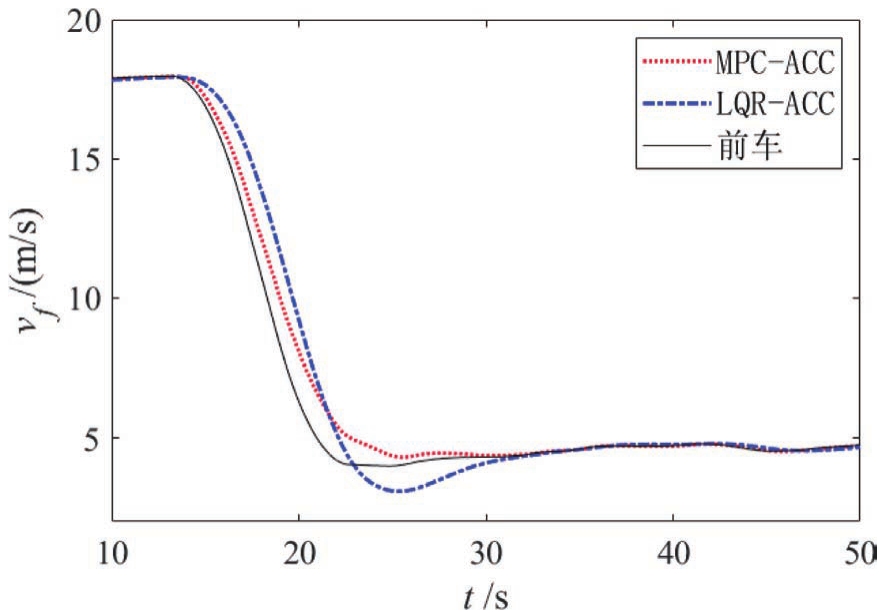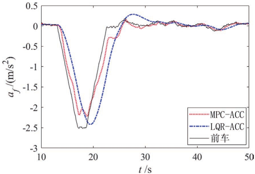 自车与前车初始速度皆为18m/s,前车于15s左右开始减速至4m/s,仿真结果如图10~图12所示。从图11和图12可以看出,MPC-ACC的加速度绝对值要略小于LQR-ACC,但MPC-ACC的减速效果要优于LQR-ACC。图10表明LQR-ACC出现了车距为3.5m的危险工况,而MPC-ACC减速平稳。