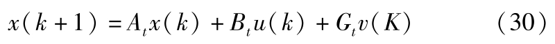 式中, a p 为前车加速度; T 为采样步长。取系统状态变量 x =[Δ d ,Δ v , a f ] T ,控制量 u = a des ,扰动 η = a p ,建立广义纵向动力学模型: