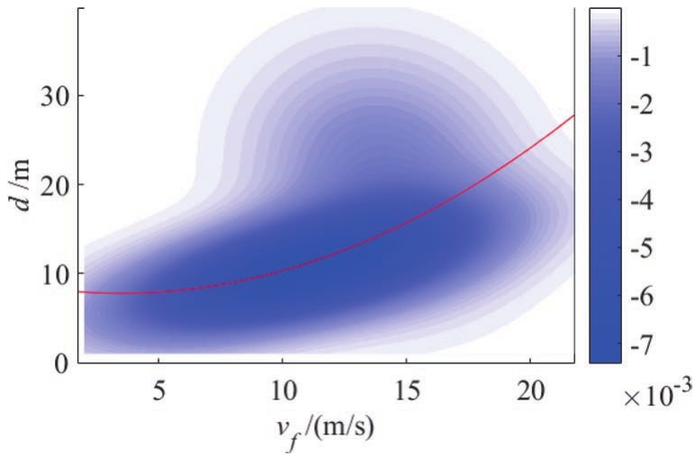 式中, v f 为自车加速度; d des 为期望距离; a , b , c 为模型参数,可以基于采集的驾驶人跟车数据,用最小二乘法求解。其拟合结果如图2所示。为了便于观察,需要做出数据点的概率密度图,红色曲线为拟合曲线。