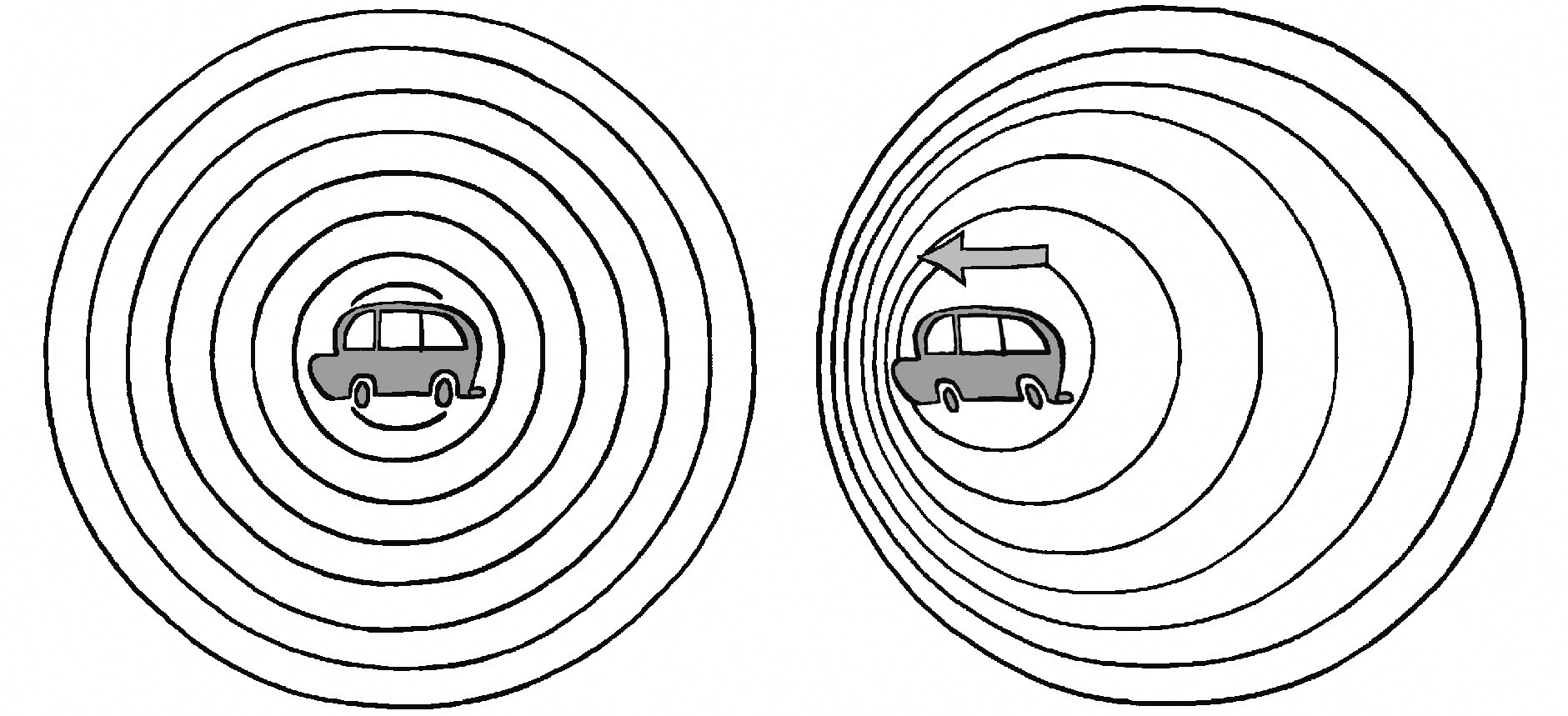要是机械从我们身边经过呢?那么我们就能听到典型的汽车引擎声,或者迅速驶过的警车鸣笛声:声音先高后低,以与我们平行的位置为切换节点。