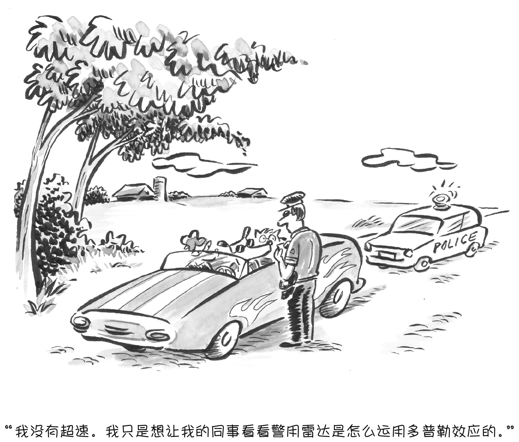 不过,如果你坐在路旁,从你面前开过的车发出的声音就不同了。如果车是向你驶来的,那它的声音会很尖锐,但是车经过你的那一瞬间以及之后越开越远的阶段,它的声音会从高音降为低音。喂咿——嗡嗡隆隆——!如果你搭过便车,你一定听到过好多次这种声音!你会听到声音的音调不同的原因,就是所谓的多普勒效应。各种各样的波都会发生多普勒效应。