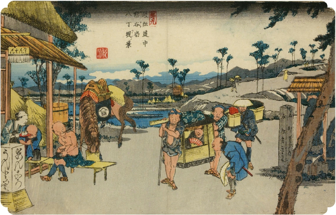 从鸿巢前往熊谷的途中会经过荒川沿岸的堤坝,溪斋英泉的《熊谷》就是以荒川左岸的熊谷堤(八丁堤)为主题进行描绘的。画面左侧是一间茶屋,此时正有骑马的客人在店内休息,店家给在门口等待的马夫端来了茶水,旅途劳顿的马匹也在补给饲料。左下角茶屋门口写着“豆沙馅饼”和“乌冬面”的招牌十分引人注目。中间有两名轿夫抬着轿子,这种叫作“宝泉寺驾笼”的轿子是江户时代民间最高级的轿子,一般只有富人才雇得起。