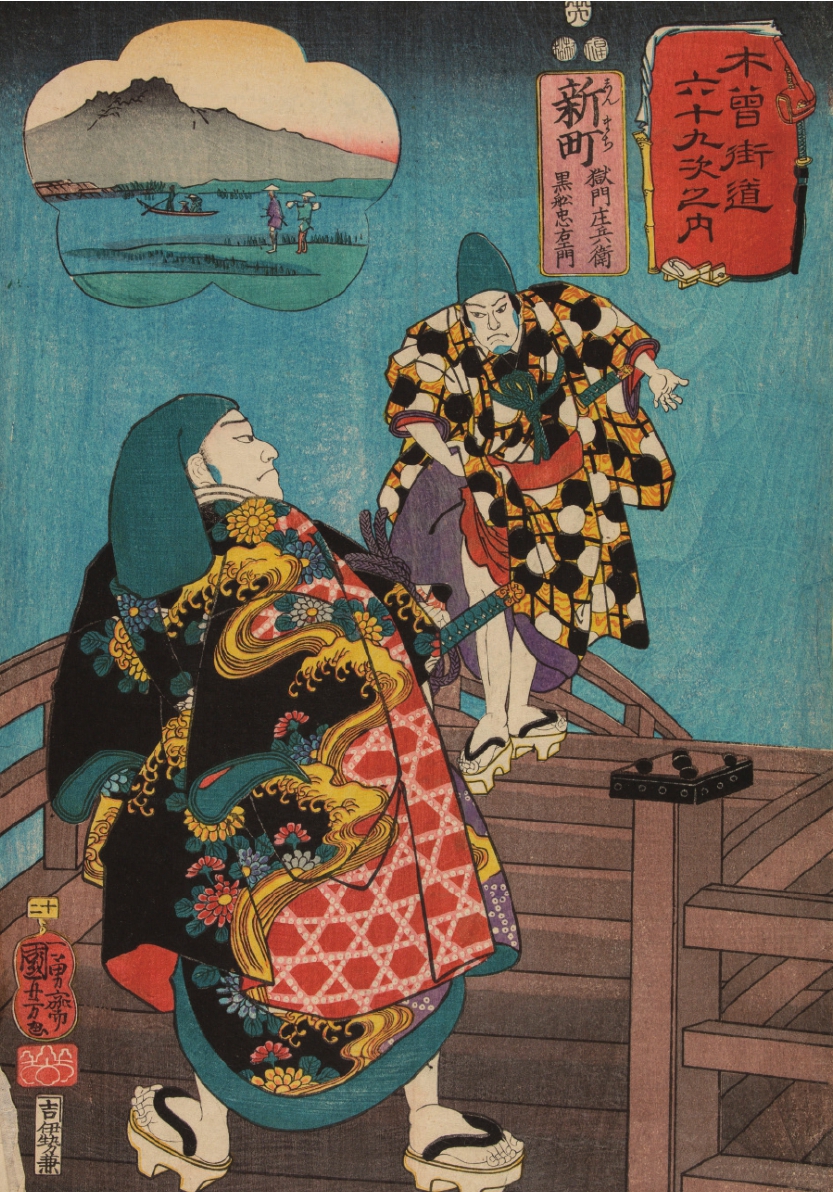 这幅画描绘的就是狱门庄兵卫和黑舩忠右卫门两人在桥头谈判的场景。画中人物有着显著的舞台风格,和服纹样夸张华丽,表情极其脸谱化。黑舩忠右卫门头上所戴的头巾造型由姉川新四郎设计,流传到后世被称为“姉川头巾”。忠右卫门的和服是菊花和海浪图案,大片的红黑撞色十分亮眼,凸显出侠客的潇洒俊逸;而庄兵卫的和服上则布满了围棋的纹样,显示了其人性格沉稳,善算计。