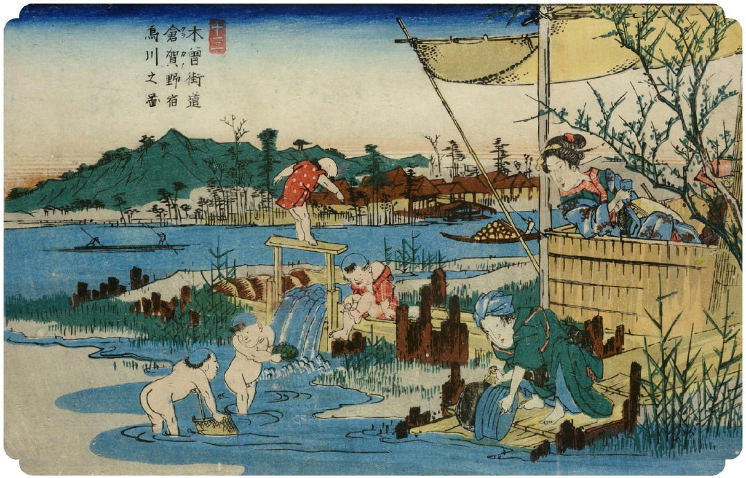前景中茶屋的女主人正在小河边洗刷锅底,在茶屋中休息的客人正兴致勃勃地注视着玩耍的孩童。英泉在画中重点刻画了女性,令人不禁联想这位旅行中的女人是要去日光,还是要去女性参拜者甚众的善光寺呢?中景的乌川上穿梭着运送木材的货船和竹筏,仓贺野就在乌川左岸。背景中高耸的山脉还是上野国的“上毛三山”。这种三段构图法是英泉在这个系列中常用的手法,稳重但不免丧失了些意趣。