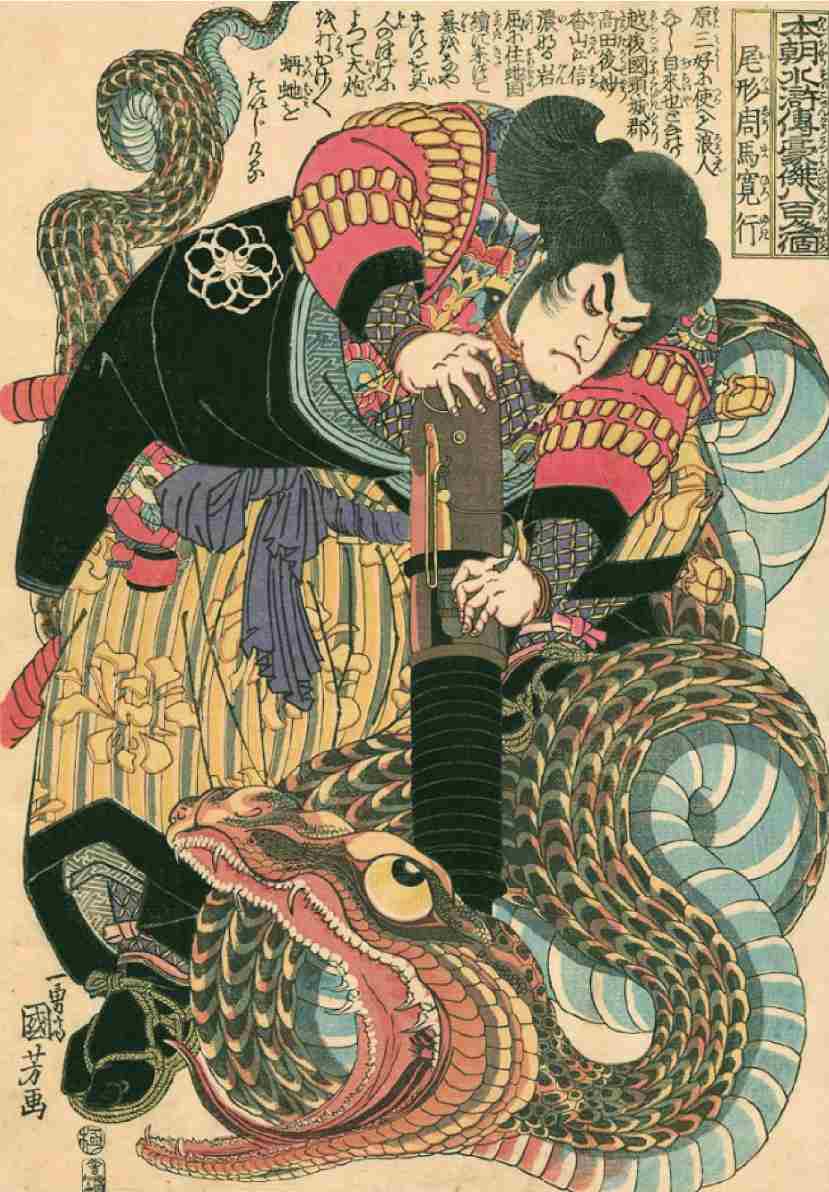 《自来也传说》中的自来也是以三好家的浪人尾形周马宽行为原型的,而歌川国芳在1830—1836年间创作系列武士绘《本朝水浒传豪杰八百人》的时候,就曾将尾形周马宽行囊括在内。