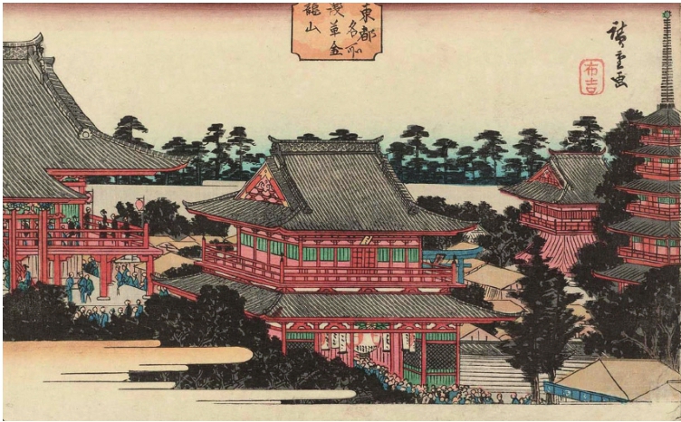 1793年,歌川广重在一个消防员家庭呱呱坠地,原名安藤重右卫门,他的父亲安藤源右卫门为“定火消同心”组织的成员,主要负责维护江户地区的防火安全,因此属于低级武士阶层。1809年,安藤重右卫门的父母相继离世。此时的他大约不会想到,自己今后会成为和葛饰北斋齐名的风景浮世绘大师。由于对绘画感兴趣,他十五岁入歌川派拜歌川丰广为师,得益于师傅内敛雅致的人品与画风,歌川广重在浮世绘的研习之路上积淀了丰厚的艺术修养和文化底蕴。从最初的歌舞伎画到美人画,从制作狂歌绘本到和本插画,歌川广重逐步形成了鲜明的个人风格。1831年,在葛饰北斋的《富岳三十六景》面世之时,歌川广重《东都名所》系列的刊行也拉开了他在名所绘领域的序章。