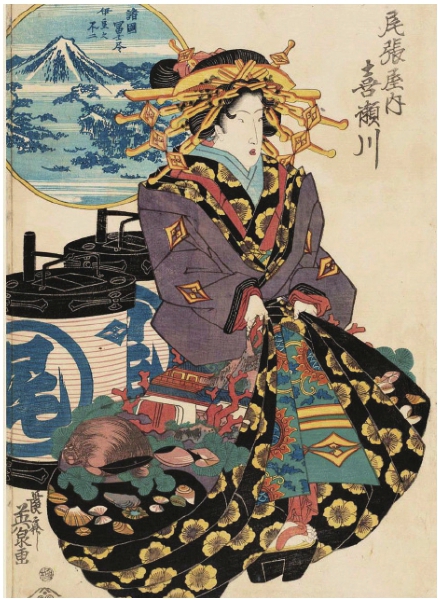 明艳动人的吉原花魁,脸谱化的歌舞伎演员,遍布日本各地的明山秀水,滑稽讽刺、针砭时弊的戏剧,天马行空、诡谲多变的鬼怪妖魔,金戈铁马的战争场面,一荷一叶间的花鸟虫鱼,都是浮世绘所描绘的对象。因此,浮世绘不仅是一种装饰艺术,更是江户时代的百科全书,它用生动形象的艺术表现手法,绘尽人间百态,成为历史的记录者和江户人民的情感寄托。