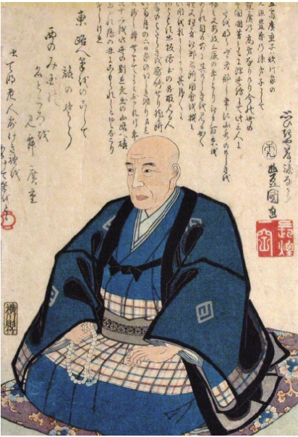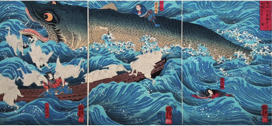 歌川国芳十分痴迷中国文化,江户时代的知名作曲家曲亭马琴将中国的《水浒传》改编为《倾城水浒传》并在日本出版后,国芳对武士题材的创作热情终于有了大显身手的舞台。他从1827年开始绘制《通俗水浒传豪杰百八人》,这部作品画风威武繁复、细腻浓烈,以异想天开的超现实手法表现水浒人物,在当时的日本引发了“水浒风暴”,国芳也因此一举成名,后被冠以“武者国芳”的美誉。