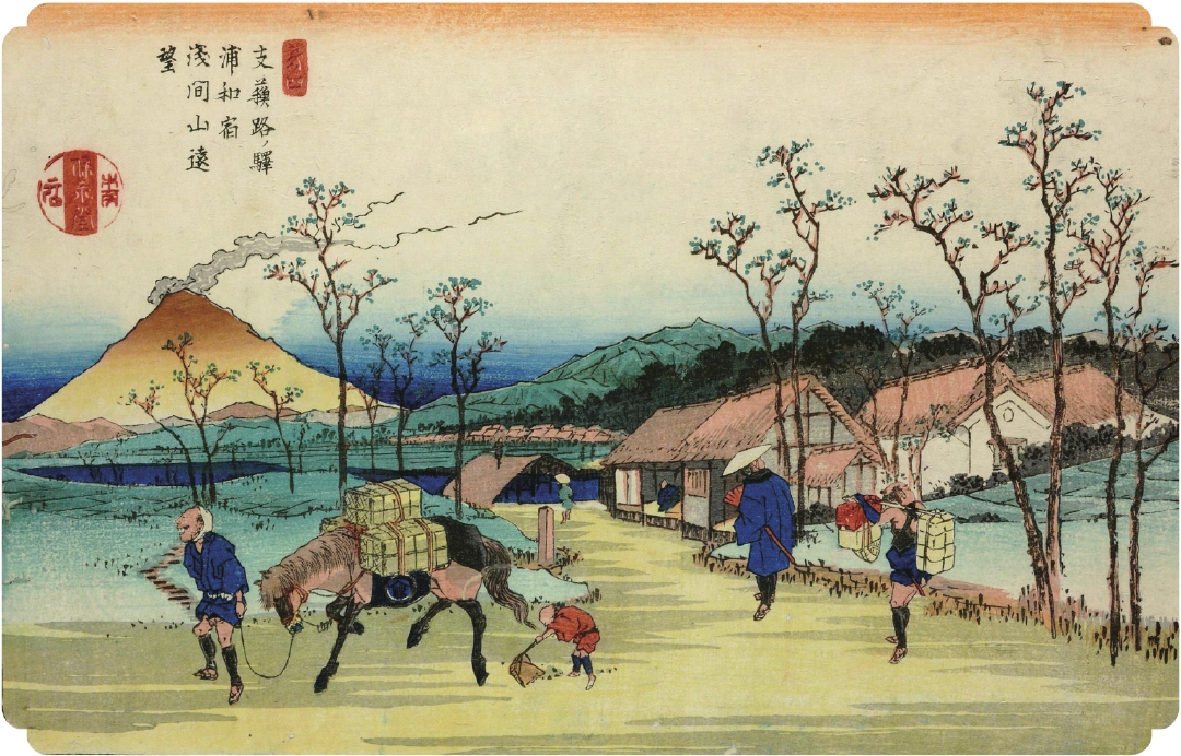 在《木曾路名胜图会》(卷之四)中,关于浦和有着这样的描述:“天空放晴的时候能够看到浅间山。”这里以独特的观景角度而闻名,溪斋英泉就在浦和宿中描绘了从宿场眺望远处浅间山的风景。画面近景处有岔路口上的两组人物特写,一组是前往浦和宿场的武士和他的仆人,另外一组是马夫和孩子。老马满载着从荒川渡口驮运的行李,收集马粪的孩子也是这一带农村特有的风景,而武士的目光回望远处江户的方向,这一切都预示着从江户出发的旅人们正式踏上了木曾路的旅途,愈行愈远。马鞍上的“林”字标识代表的是出版社。