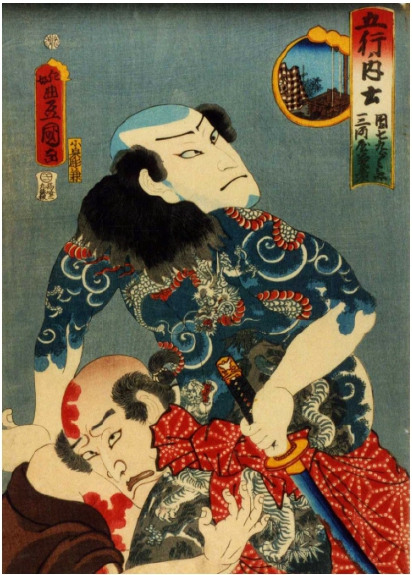 这幅画中就是团七误杀义平次之后,正在用水冲洗身上的泥污和血迹的情景。画中的团七赤膊裸背,靛蓝色的刺青和腰间所缠的红布形成鲜明的对比。从远处飘扬的天王御祭礼的旗幡可以看出故事发生在高津神社的夏日祭典之时。夏祭本是日本的传统节日,起源于宗教,祈祷五谷丰登、生意兴隆和家庭兴旺。从背景中可以看出举着灯笼和旗帜的人群正缓缓走过,场面热闹喧哗。