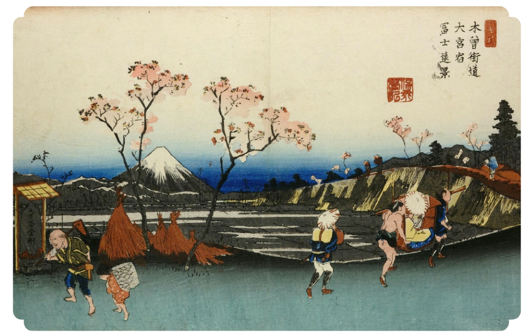 说起大宫宿,人们自然而然地就会想到冰川神社,但溪斋英泉却避开了这处名胜,转而描绘从大宫宿场附近远望富士山的风景。此时正值早春,沿路的樱花怒放。左下角写有“青面金刚”的石碑是针谷村边界上的庚申冢。石碑前扛着锄头的农夫和背着竹笼的少女正缓缓走过。右侧背着行囊的旅人和坐轿子的客人刚刚离开大宫宿。远处富士山顶白雪皑皑,屹立天际。近景处呈三角形的草堆和远处的富士山相呼应,而两株樱树呈倒三角形,将富士山夹在中间,形成了视觉上的平衡感。从樱花间遥望富士山,令人联想到同时作为樱花之神和富士山祭神的木花开耶姬,给这幅画又增添了些许浪漫色彩。