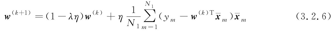 当取 N 1 =1时小批量退化成单样本SGD。与式(3.1.29)比,在 w ( k ) 前多了一个收缩因子(1- λη ),并增加了一个超参数 λ 。