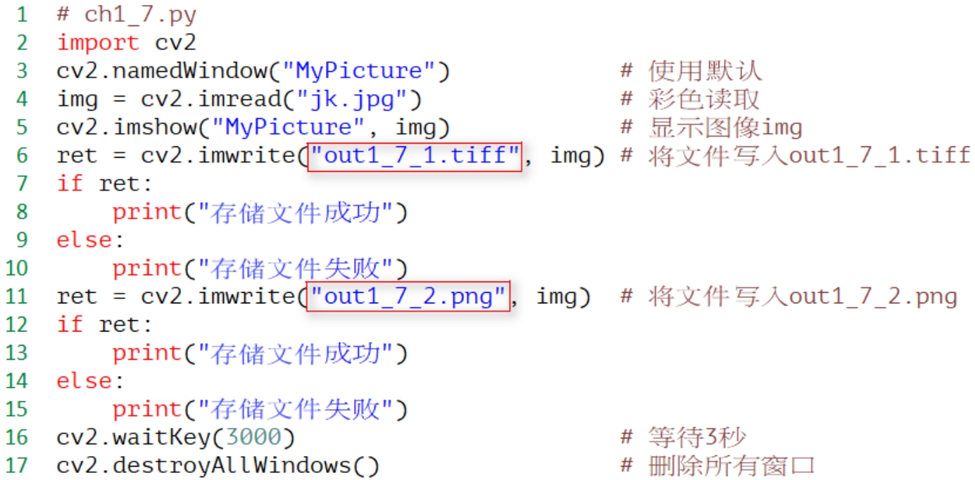 程序实例 ch1_7.py: 将jk.jpg存储成out1_7_1.tiff和out1_7_2.png。