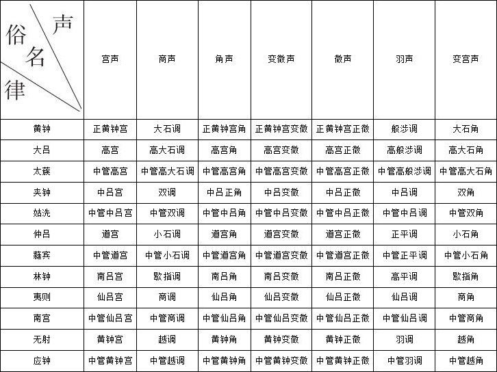 宫调之法,非自元曲始也,于古已早详备之。《礼记》云“五声六律十二管,还相为宫也”,此语为宫调之总诀。其事属于器数,法至简易,并无何种神秘。自后人以阴阳卦气十二月令之说参杂之,乃转而为神秘矣。今参对西洋乐器,而列表以说明之。