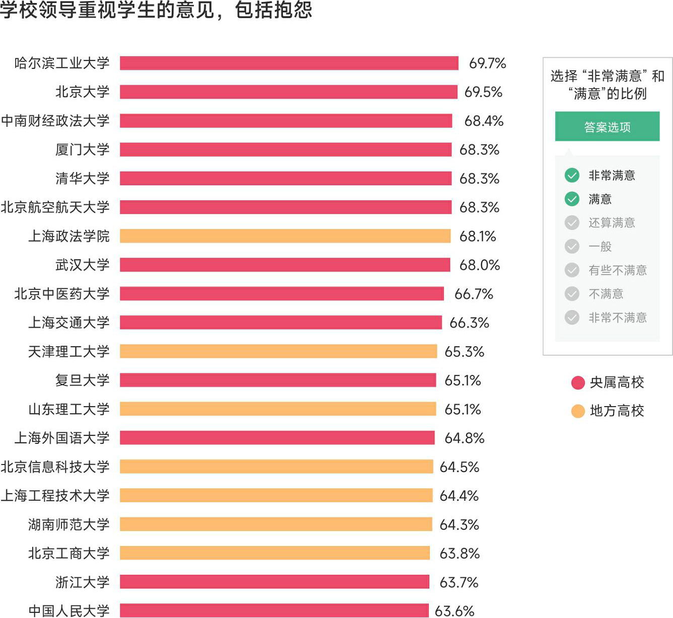 倾听学生意见,及时做出反馈,是提高学生校园生活体验、完善校园服务建设、推动学校发展的重要渠道之一,也是学生们普遍关注的问题,但该项目上的全国大学生的总体满意度仅为49.3%。在这一项上,哈尔滨工业大学、北京大学表现十分突出,分别有69.7%、69.5%的学生对高校的学生意见重视情况表示满意。中南财经政法大学、厦门大学、清华大学、北京航空航天大学均有68.3%以上的学生表示满意,而上海政法学院以68.1%的满意度,成为地方高校在该项目上满意度最高的学校。