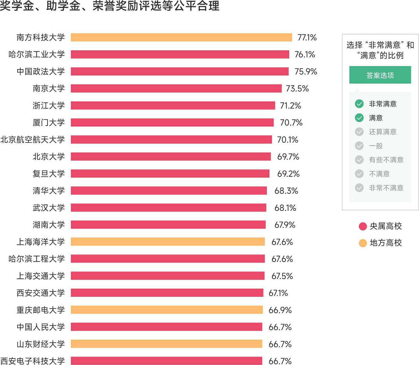 本次调查中,奖助学金评选公平合理仍是学生十分关心的一个方面,有53.7%的国内大学生在该项目上选择了满意或非常满意。在前20的高校中,学生对各高校在此项目上的满意度普遍较高,66.7%以上的学生选择了满意或非常满意。77.1%的南方科技大学学生对学校该项工作感到满意或非常满意,位列第一。哈尔滨工业大学、中国政法大学分别以76.1%、75.9%的学生满意度位居全国高校第二、第三。南京大学、浙江大学、厦门大学、北京航空航天大学均有7成以上学生对此工作感到满意。