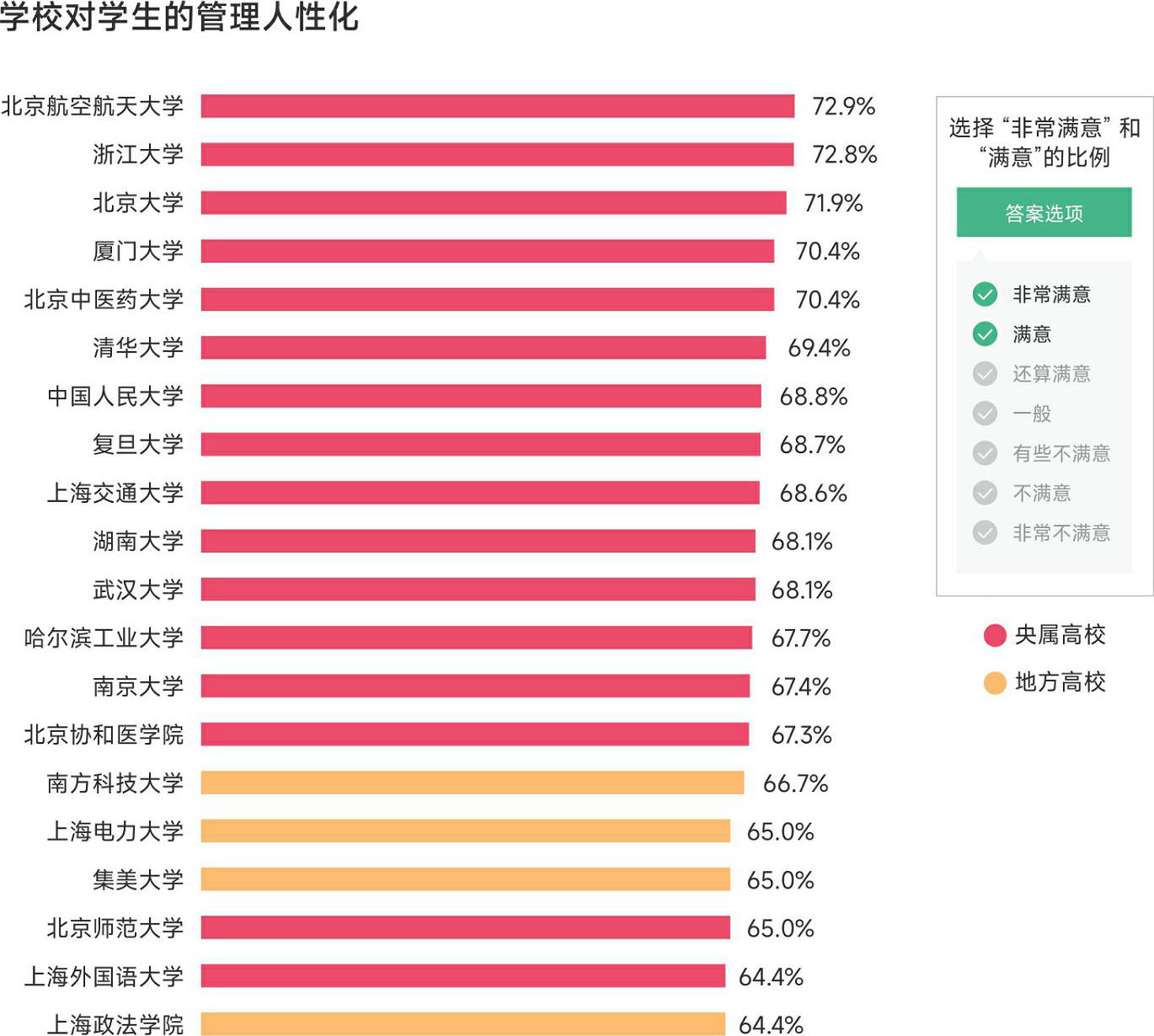 “学校对学生管理人性化”是除了“吃”和“住”两项日常生活体验外,学生最关注的项目,但该项仅有51.3%的学生表示满意或非常满意。本次调查中,北京航空航天大学以72.9%的学生满意度位居第一,浙江大学以72.8%的学生满意度紧随其后。北京大学有71.9%的学生感到满意,厦门大学、北京中医药大学均有70.4%的学生在该项目上感到满意。南方科技大学有66.7%的学生感到满意,是该项目上满意度最高的地方高校,上海电力大学、集美大学、上海政法学院作为地方高校,亦进入该项目上满意度较高的前20所学校榜单中。