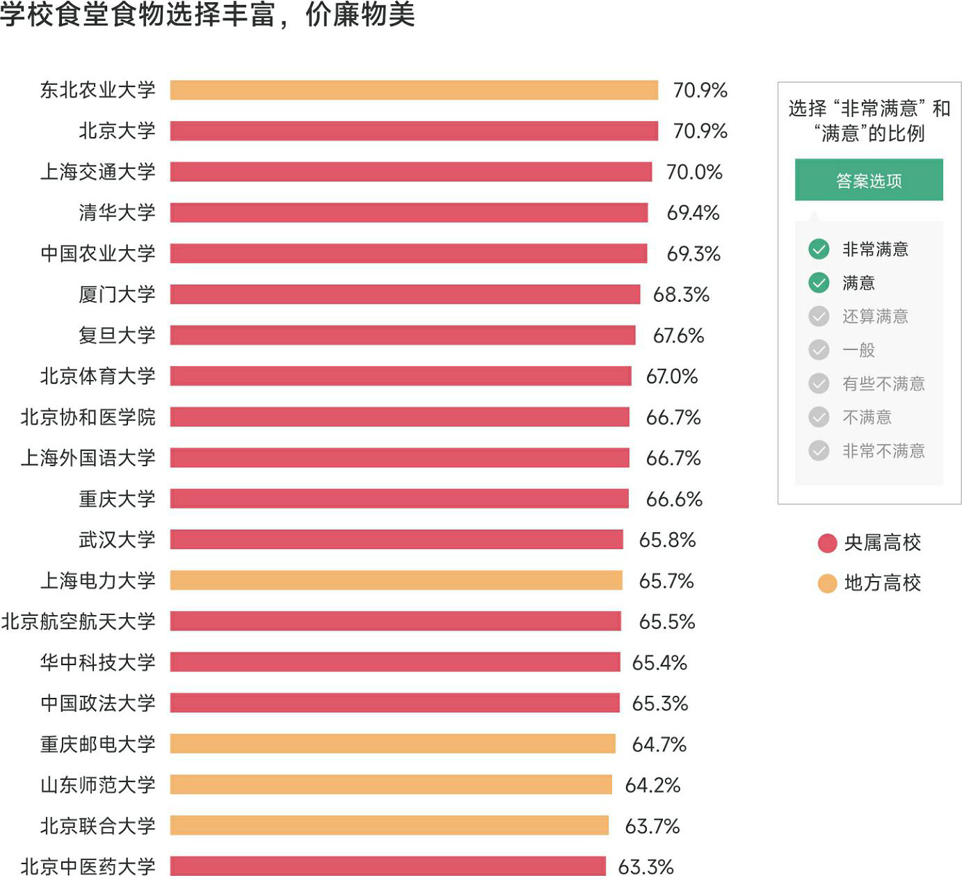 本次调查中,“食堂选择丰富价廉物美”成为本科生最关注的项目,不过学生对母校食堂的满意度普遍不高,仅50%的学生为母校的食堂美食给出了满意或非常满意的评价,该项目的满意程度位列第二十六名,说明多数学校食堂还有较大的改善和提升空间。东北农业大学与北京大学均有70.9%的学生对学校食堂感到满意或非常满意,上海交通大学以70%的比例位居第三位。值得注意的是,中国农业大学有69.3%的学生感到满意或非常满意,位列第五位。农业类大学不负“舌尖上的大学”之名,一举占据学校食堂满意度前五中的两席,其食堂美食的满意度受到学生的广泛好评。