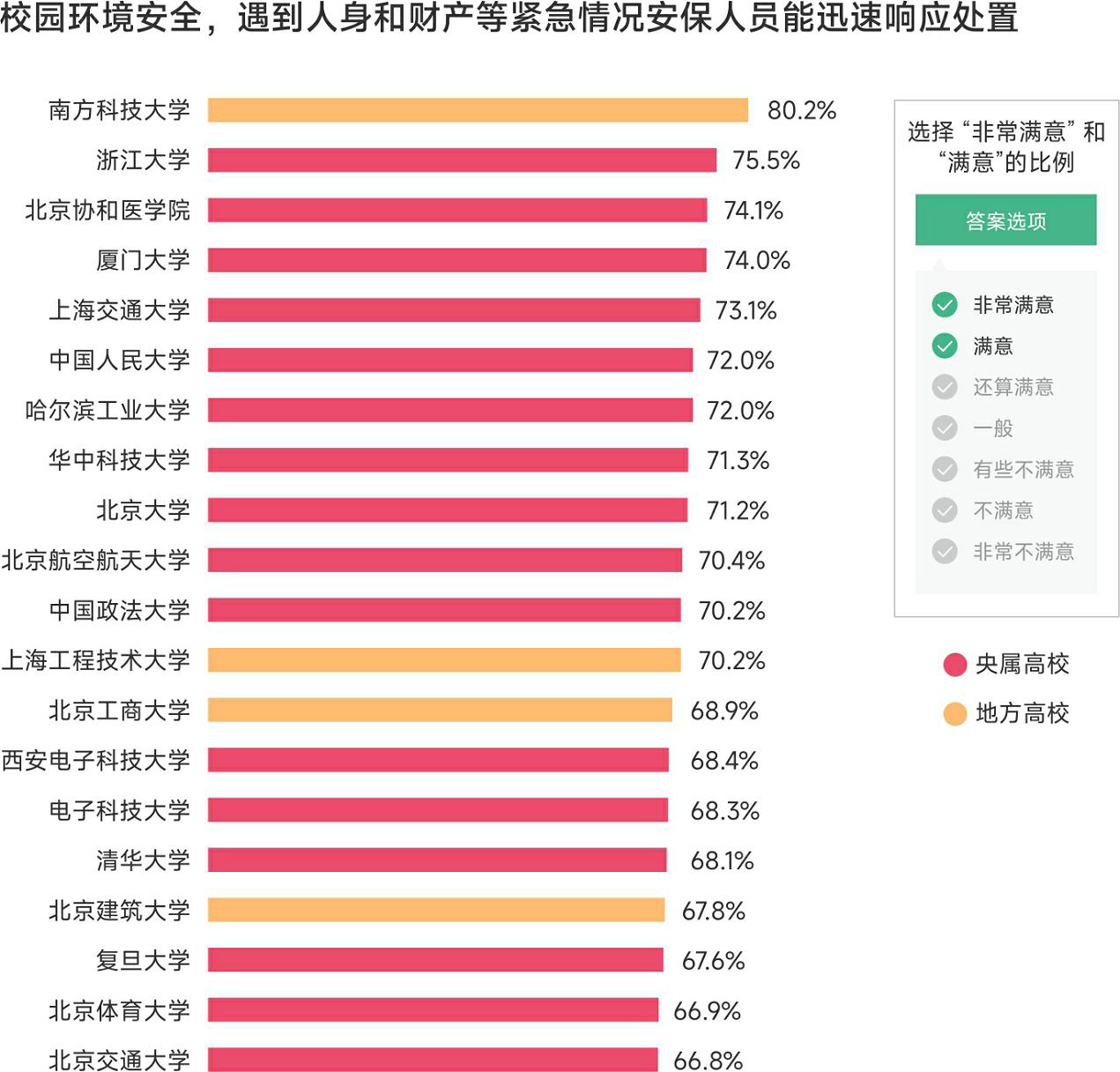 校园环境安全,是学生能够安心学习、教师能够静心教研的重要保障之一,在今年的调查中受关注程度排在第10位,并有54.2%的学生对此表示满意或非常满意。南方科技大学在本次调研中,有80.2%的学生对校园环境安全感到满意或非常满意。浙江大学紧随其后,有75.5%的学生认为学校的校园环境安全,北京协和医学院、厦门大学、上海交通大学均有73%以上的学生表示认可,其余70%以上学生感到满意的高校,其比例非常接近。上海工程技术大学、北京工商大学、北京建筑大学3所地方高校亦进入前20。