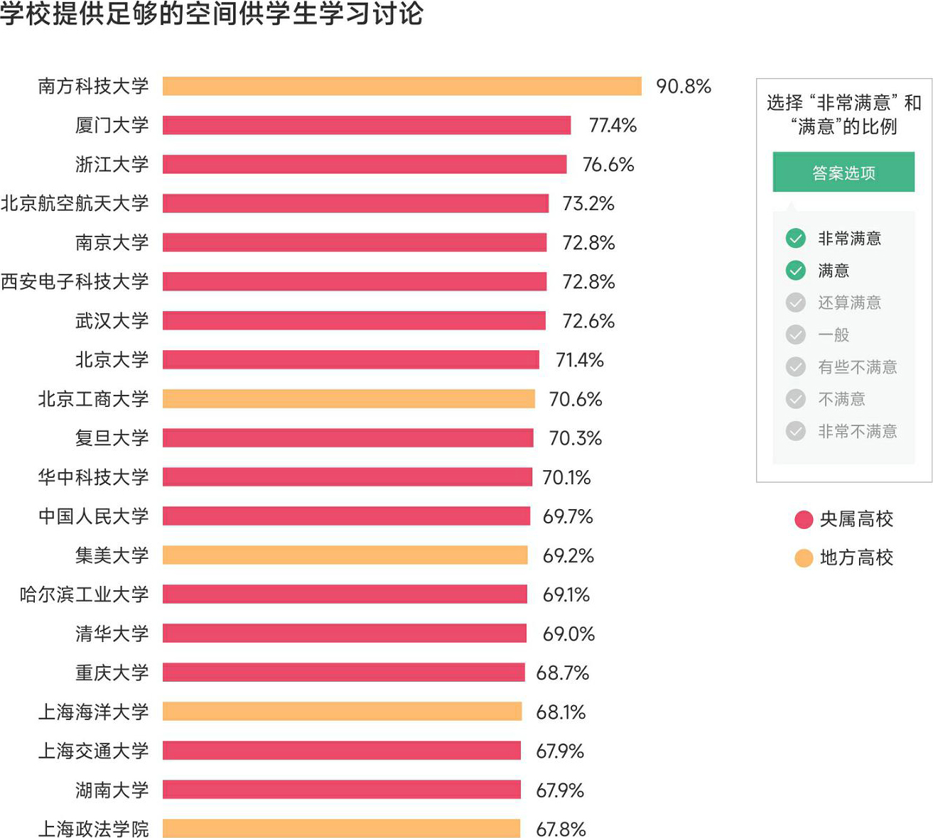 “学校提供足够的空间供学生学习讨论”这一项在今年的调查中受关注程度排在第11位,有54.8%的学生对此表示满意或非常满意。学习与讨论的空间概括来说包括学校提供的教学楼、图书馆、自习室、多功能学习中心等,赋予学生的意义不仅仅是空间本身,曾有研究表明,良好、充足的学习讨论空间能有效促进学生主动参与学习、探究,促进学生的社会交互性,对学生的行为模式有显著的影响。在该项目上,南方科技大学获得了最高的学生满意评价,可谓断崖式领先,有90.8%的学生对学校的学习空间条件表示满意或非常满意,也是该项目上唯一一所满意度超过90%的高校。厦门大学和浙江大学名列第二和第三,分别有77.4%和76.6%的学生为母校投下了满意票。此外满意度超过70%的高校还有北京航空航天大学、南京大学、西安电子科技大学、武汉大学、北京大学、北京工商大学、复旦大学和华中科技大学。