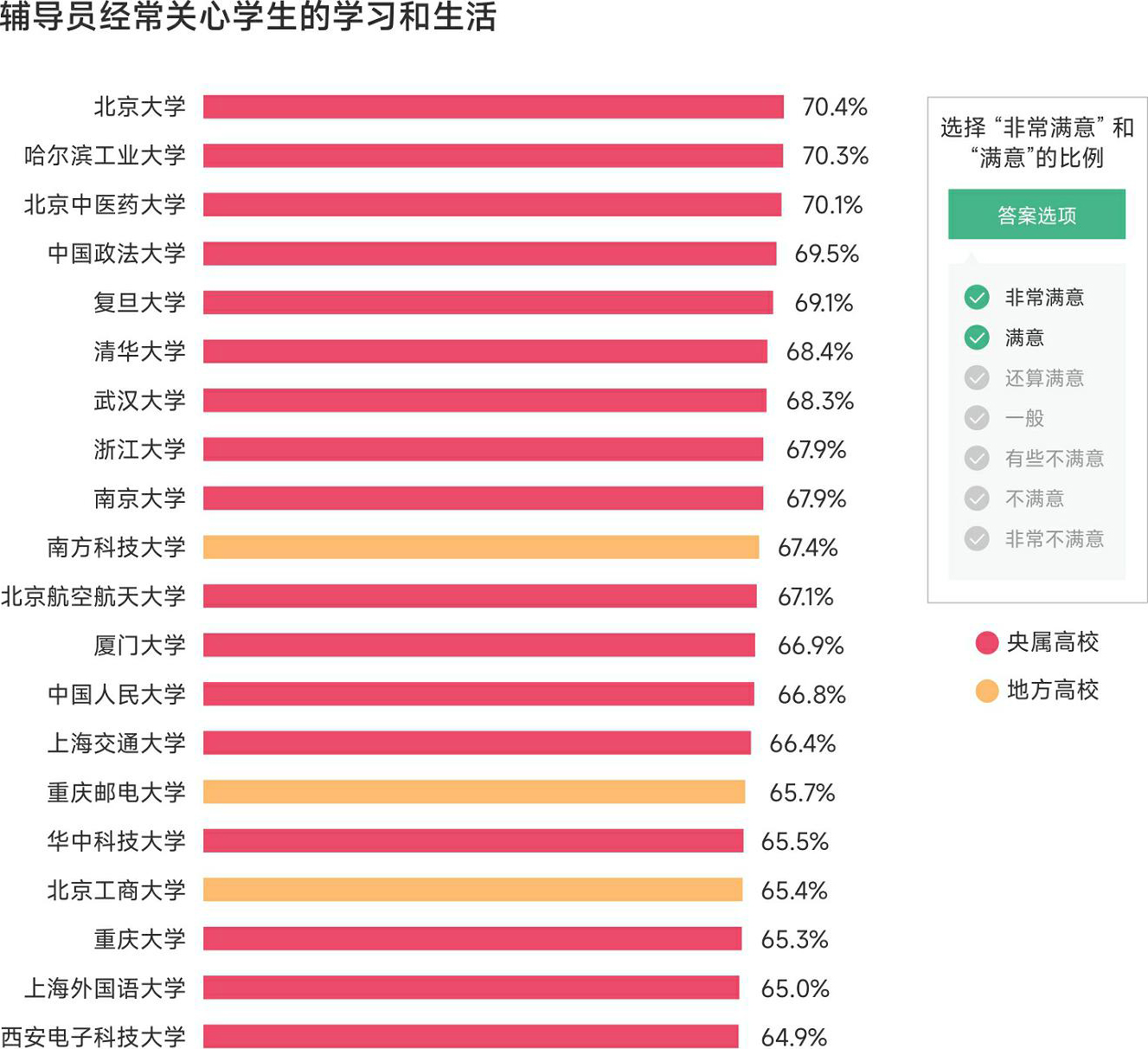 辅导员在学生的成长方面肩负多方面的责任,大学生正处在人生观、价值观、世界观的形成时期,辅导员这一类似于“班主任”的角色,对学生的引导非常重要。尤其新入学的大学生,在学习、生活等许多方面也需要辅导员的密切帮助。那么,高校的辅导员工作做得好不好?学生的满意程度如何呢?在2023大学生满意度调查中,对于“辅导员经常关心学生的学习和生活”这一选项,有62%的学生表示关注或非常关注,同时52.8%的学生表示满意或非常满意。北京大学、哈尔滨工业大学和北京中医药大学的满意程度排到了全国高校的前三名,三所高校的满意度均在70%以上。此外中国政法大学、复旦大学、清华大学、武汉大学、浙江大学、南京大学等高校的表现也非常出色。值得一提的是,在这一项目上,有3所地方高校上榜前20名,它们分别是南方科技大学、重庆邮电大学和北京工商大学。