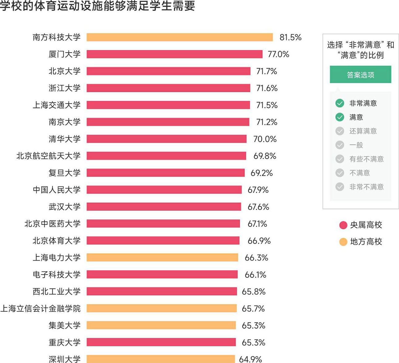 在加快建设体育强国、全民提高身体素质意识不断加强的环境下,学生对体育运动设施的需求和关注度也不断提高。在本次调查中,该项目上有51.5%的学生感到满意。南方科技大学有81.5%的学生对学校该项目工作表示满意,排在第一位。厦门大学有77%的学生选择满意或非常满意,排在第二位。北京大学、浙江大学、上海交通大学、南京大学、清华大学均有70%及以上的学生对此感到满意,认为学校的体育运动设施能够满足学生的需要。上海电力大学、上海立信会计金融学院、集美大学、深圳大学作为地方高校,同样上榜该项目上满意度前20高校。