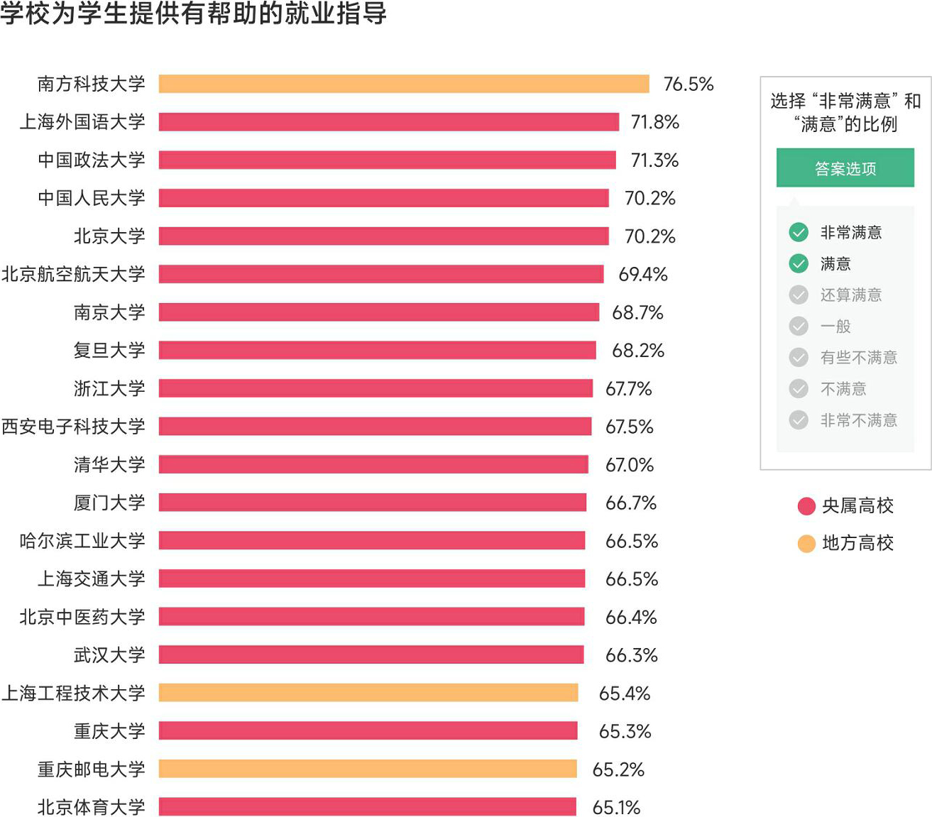 就业是学生步入大学进行学习的终极目标,也是学生普遍关注的一个项目。在“学校为学生提供有帮助的就业指导”上,有52.4%的学生表示满意或非常满意。具体来看,南方科技大学有76.5%的学生为学校的就业指导工作投下了满意或非常满意票。满意程度较高的其他学校还有上海外国语大学、中国政法大学、中国人民大学、北京大学等,满意程度均超过70%。
