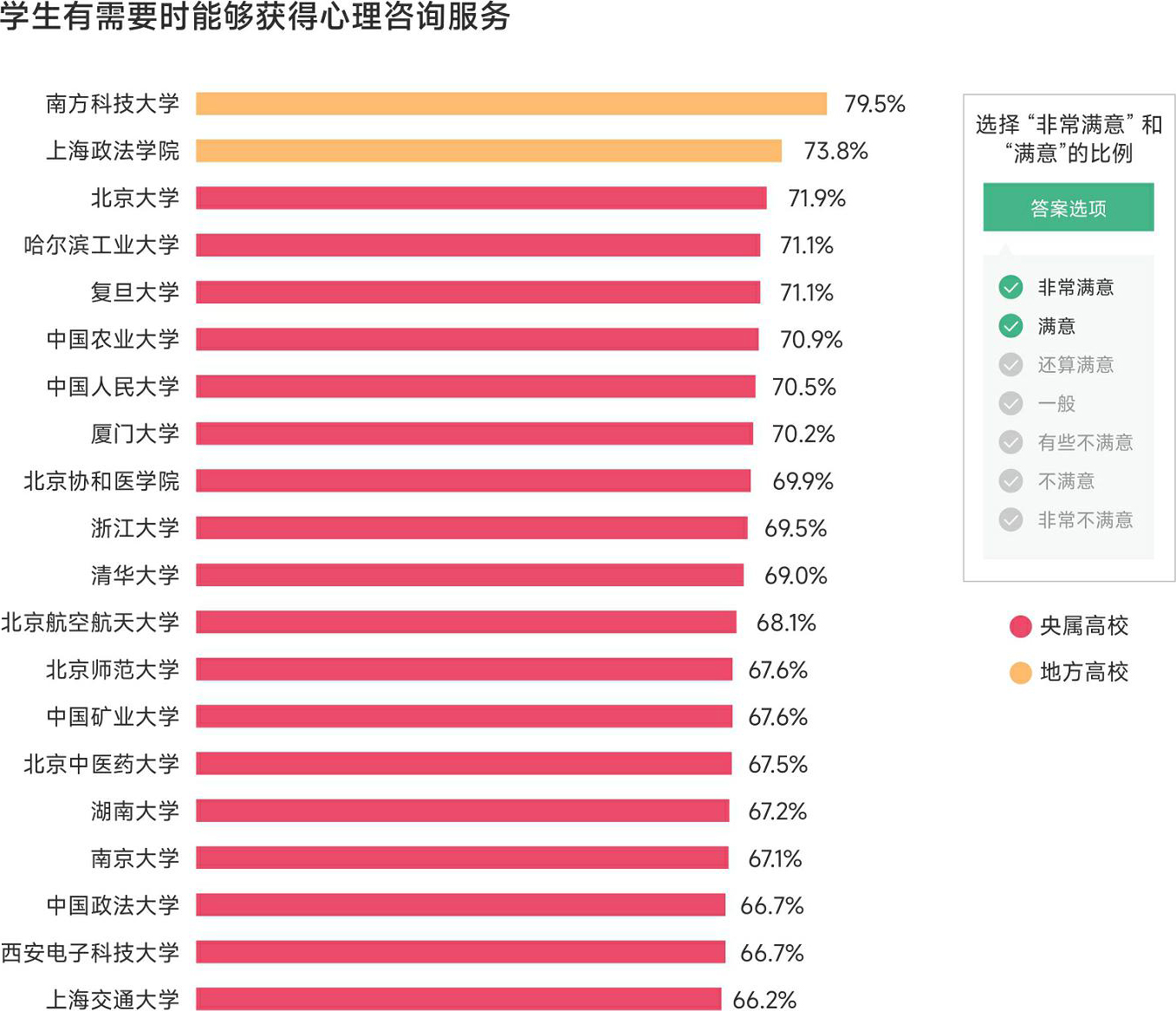 当前,心理咨询服务已经成为校园基础服务的必需项。不同于基础的医疗服务,心理咨询服务更多关注大学生的心理健康教育、心理普查与测试,以及必要的个体心理咨询,帮助大学生走出阴霾,营造健康的身心状态。整体上,有55.4%的大学生对学校提供的心理咨询服务表示满意或非常满意。具体来看,在“学生有需要时能够获得心理咨询服务”选项上,南方科技大学再次遥遥领先国内高校,有高达79.5%的学生选择了满意或非常满意。排在第二名的是上海政法学院,其满意程度也高达73.8%。可见“小而美”的院校在这方面优势明显。此外北京大学、哈尔滨工业大学、复旦大学、中国农业大学、中国人民大学、厦门大学的满意程度也都超过了70%。
