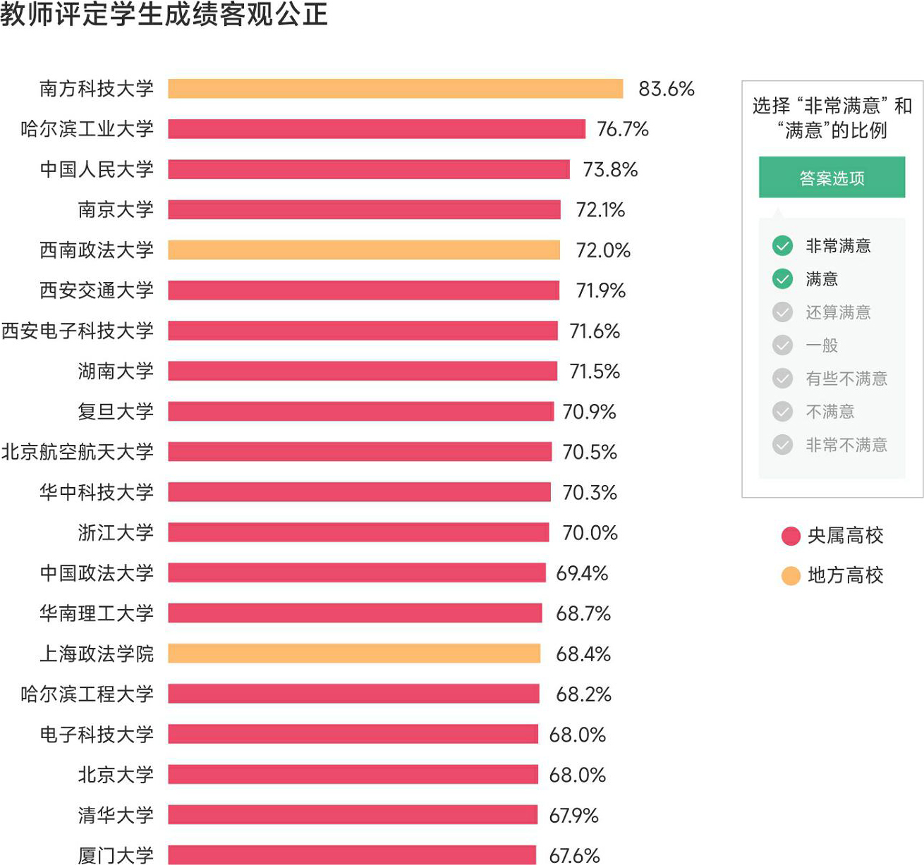 教师评定成绩客观公正同样也是大学生较为在意的一个方面,在2022发布的调查结果中,该项目的关注度曾排在所有调查项目的第6名。在2023年的调查结果中,该项目关注度有所下降,排在了第14名,整体上有62.5%的学生选择了关注或非常关注,有55.4%的学生表示满意或非常满意。南方科技大学和哈尔滨工业大学在该项目上的学生满意度排在前两名,选择满意和非常满意的学生比例分别有83.6%和76.7%。中国人民大学排名第三,有73.8%的学生表示满意。此外满意程度在70%及以上的高校还有南京大学、西南政法大学、西安交通大学、西安电子科技大学、湖南大学、复旦大学、北京航空航天大学和华中科技大学、浙江大学。