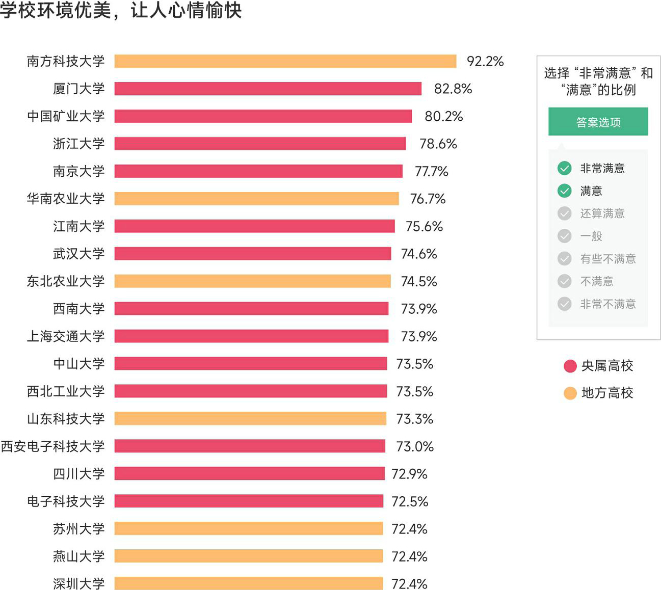 校园环境方面,南风北韵,各有千秋。国内学生对学校的校园环境满意度普遍较高,57.2%的学生对母校的校园环境感到十分满意,满意度程度在所有项目中位居第二,排名前20的学校均有72%以上的学生在校园环境项目上选择满意或非常满意。其中,为南方科技大学选择满意或非常满意的学生比例高达92.2%,位居全国第一,也是唯一一所90%以上学生感到满意或非常满意的高校。厦门大学、中国矿业大学分别位居第二位和第三位,均有80%以上的学生对校园环境表示满意。浙江大学、南京大学、华南农业大学、江南大学均有75%以上的学生感到满意。