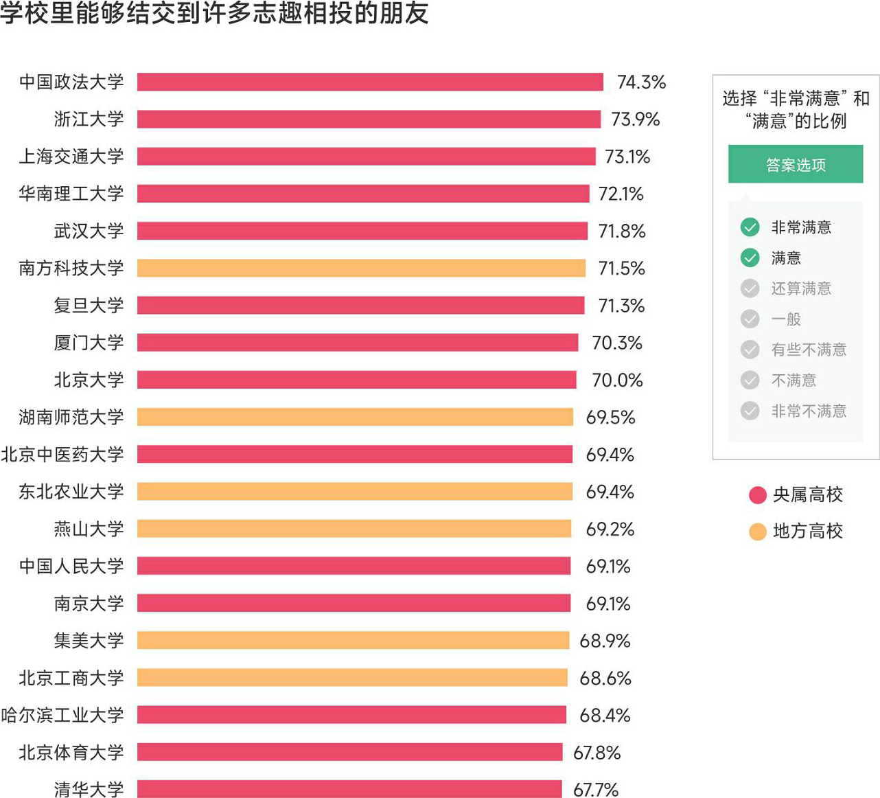 大学期间是否能够收获志趣相投的朋友,也成为学生较为关心的一个方面,56.5%的学生对学校在该项目上的工作表示满意或非常满意。在这一项上,中国政法大学有74.3%的学生表示满意,位列第一。浙江大学、上海交通大学都有73%以上的学生认为在学校里能结交志趣相投的朋友。华南理工大学、武汉大学、复旦大学、厦门大学、北京大学几所央属高校均有70%及以上的学生感到满意或非常满意。南方科技大学成为唯一一所70%以上的学生对此感到满意的地方高校。